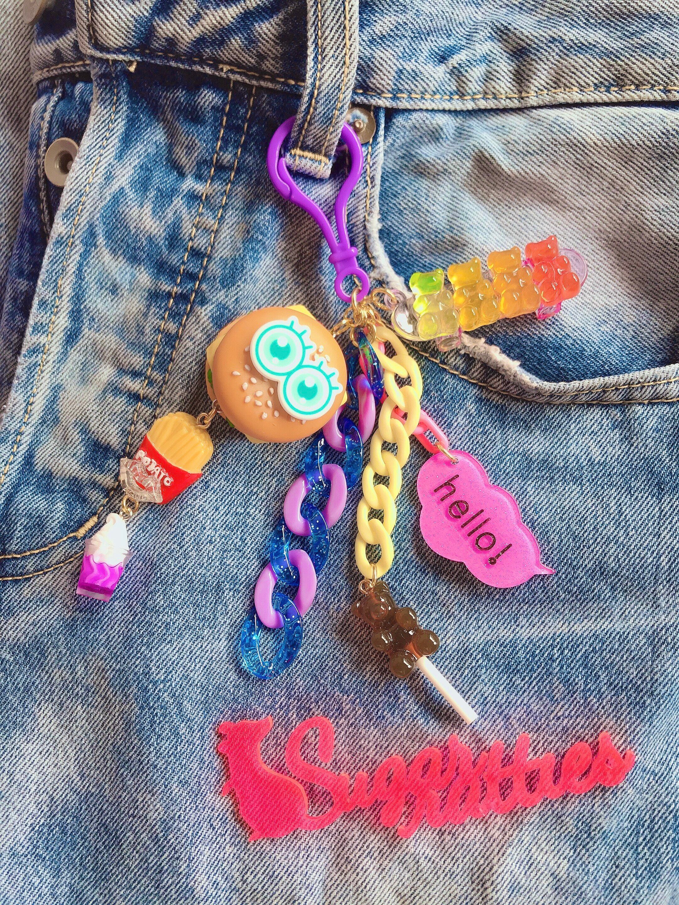 目玉付きハンバーガーにポテト、ドリンクが連なるプラチェーンキーホルダー。