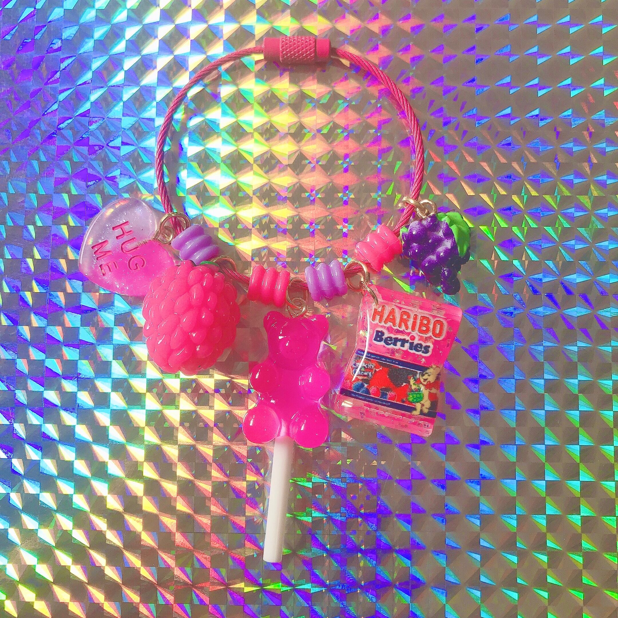 ベアグミ型のロリポップキャンディとたくさんのお菓子やアイス、フルーツなどが揺れるワイヤーキーリング。