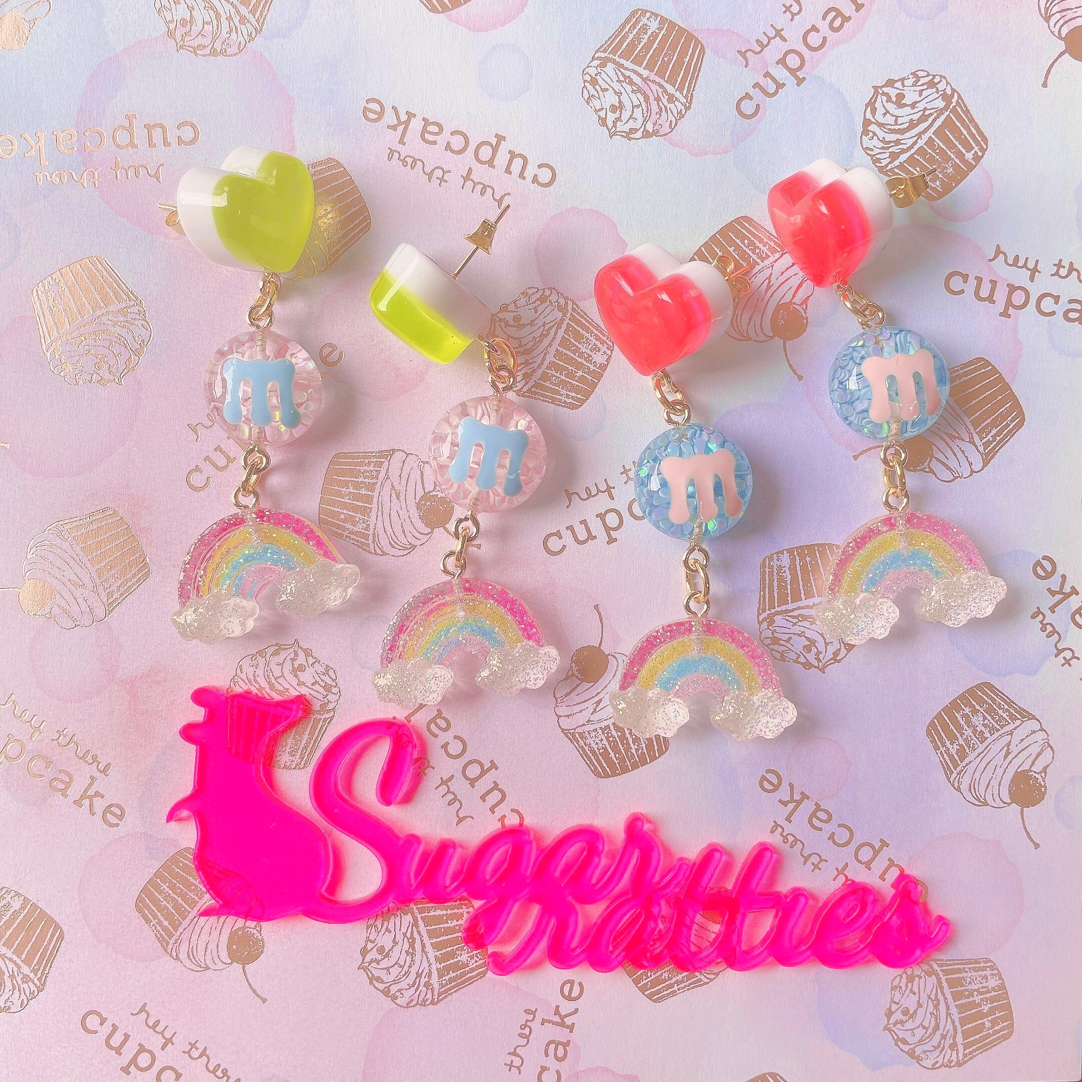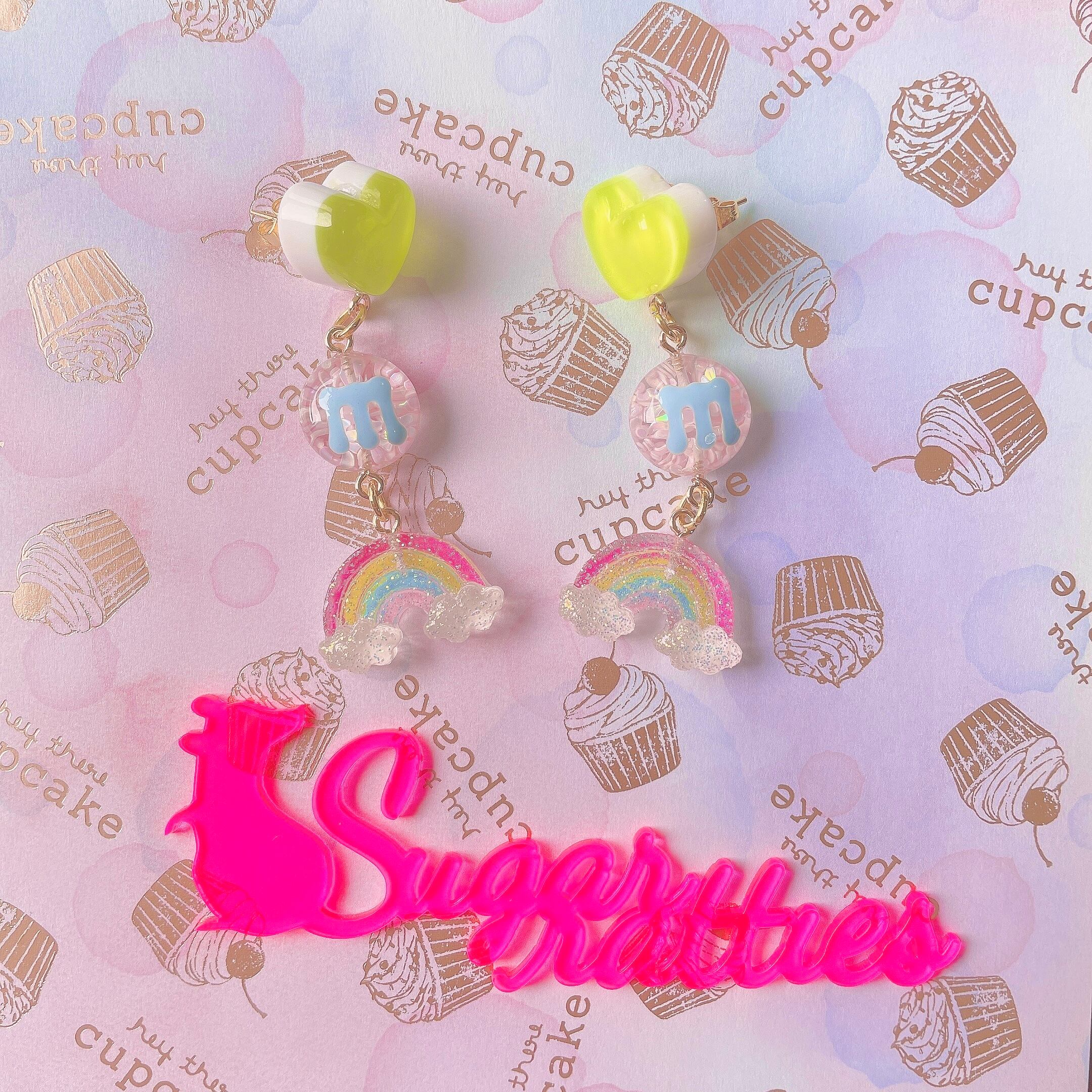 キシリトールキャンディみたいな二層のハートにホロ入りのぷっくりmチョコ、ザラメのようなラメがまぶされた虹が揺れるピアス。