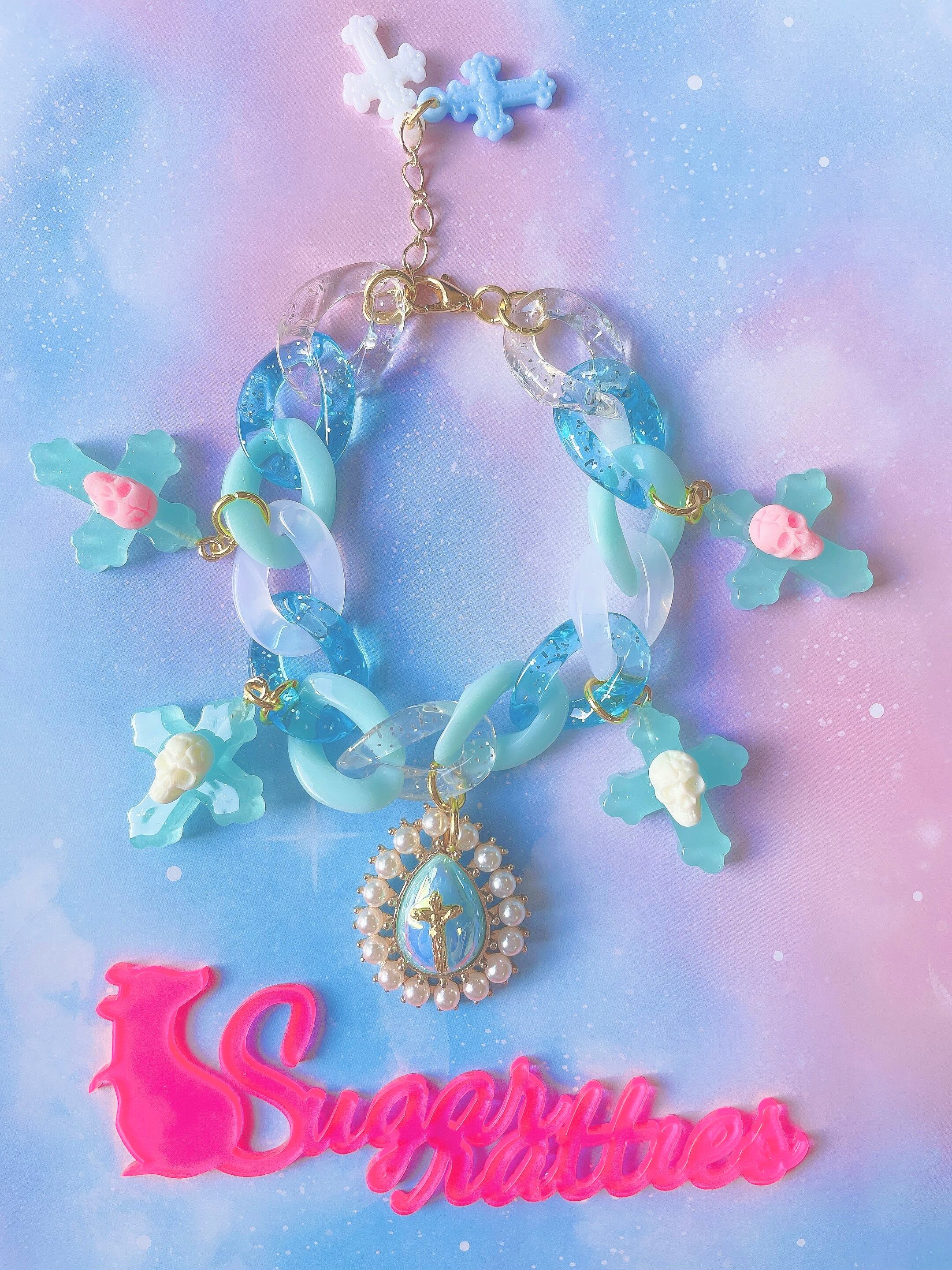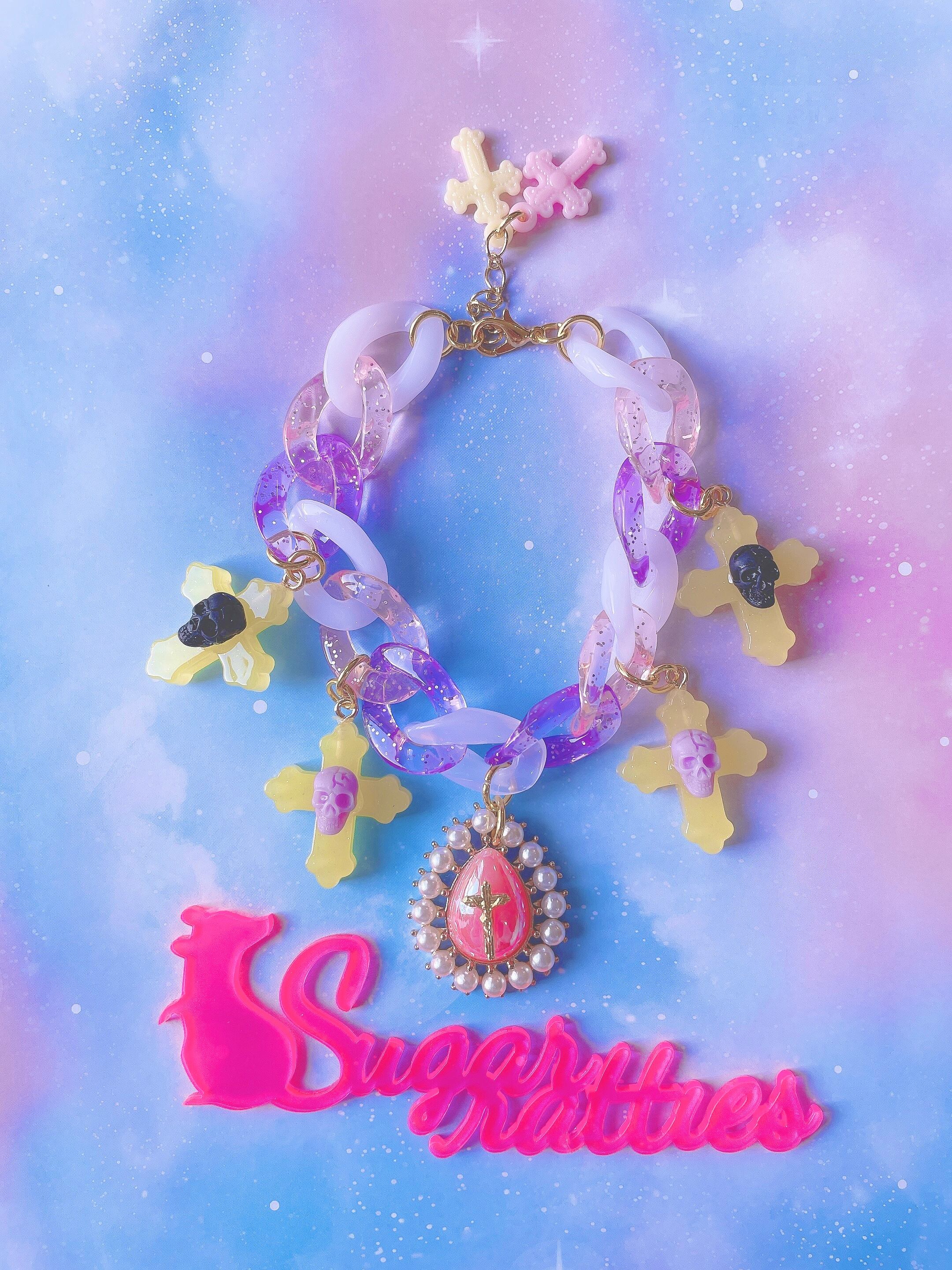 十字架で飾ったドロップ型の大粒オーロラストーンと4つのスカルクロスが揺れるプラチェーンブレスレット。