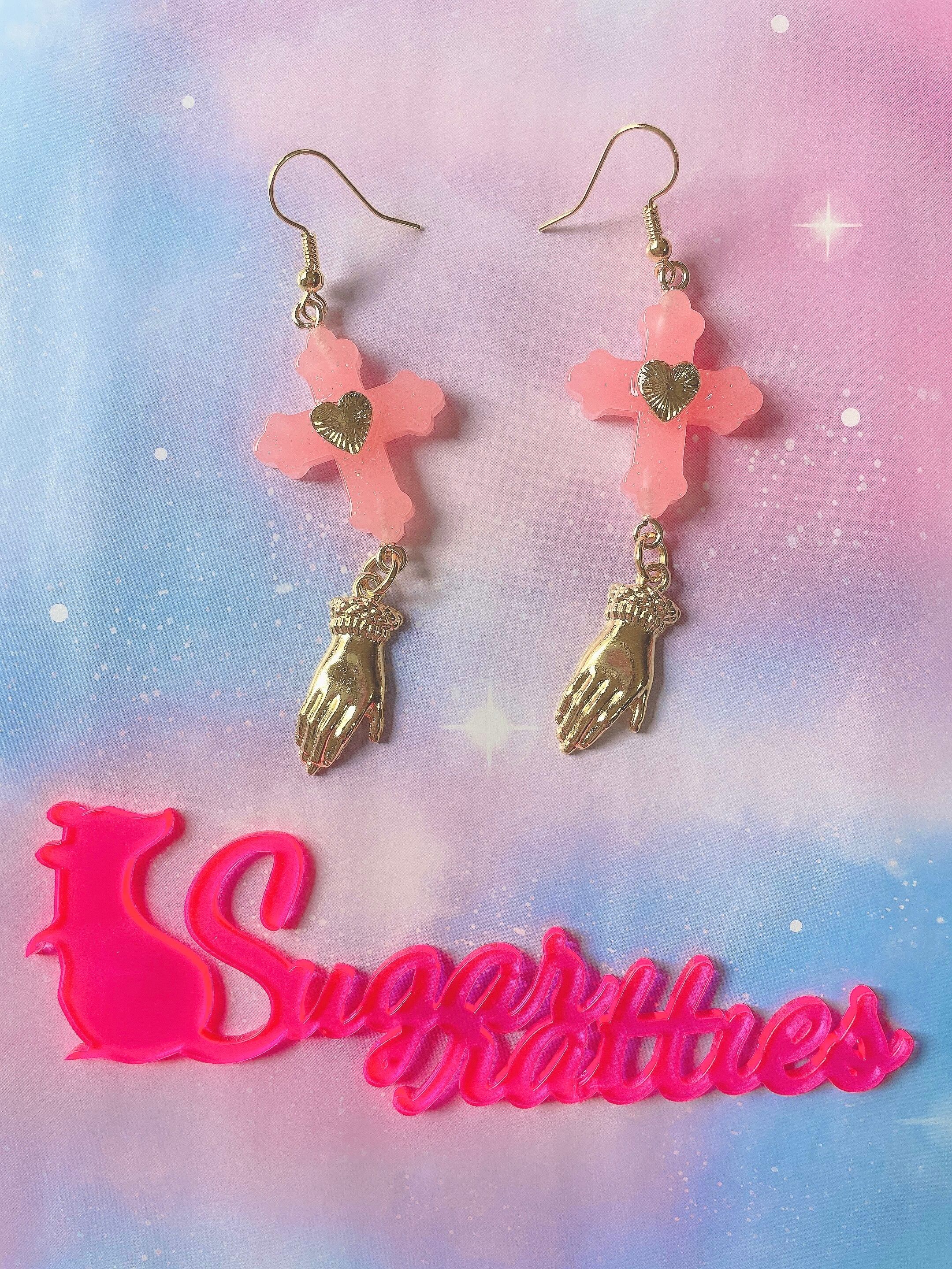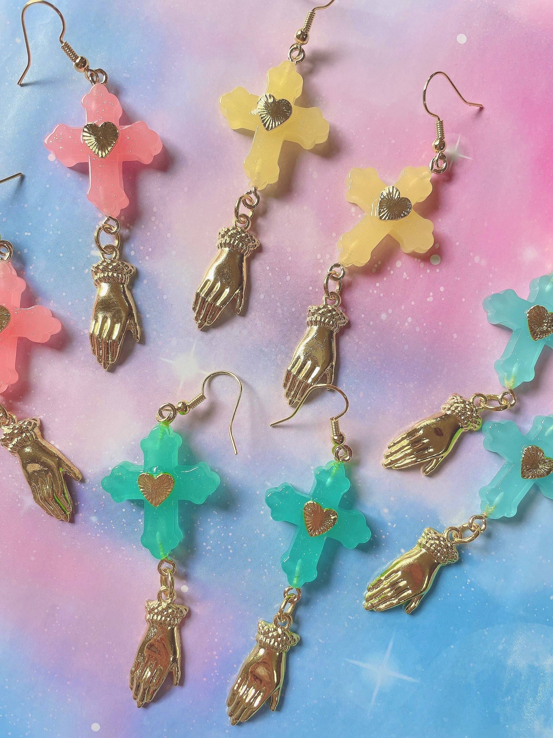 ハートで飾られた十字架から黄金に輝く救いの手が揺れるピアス。