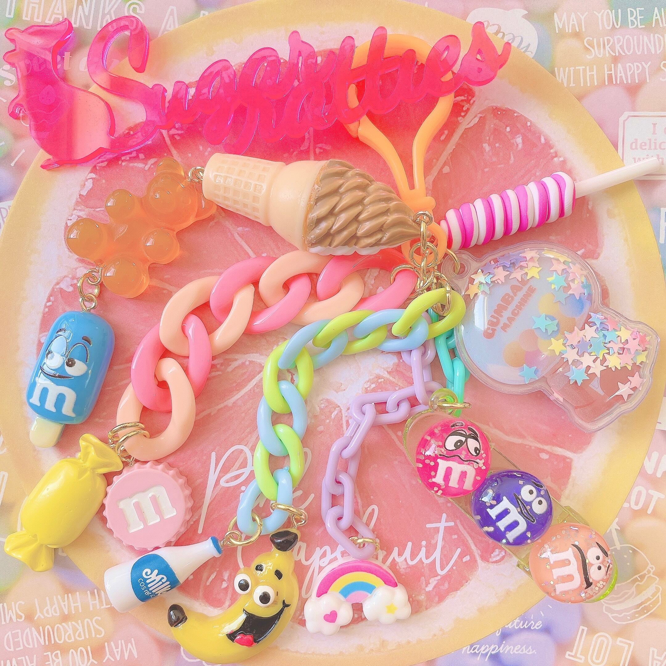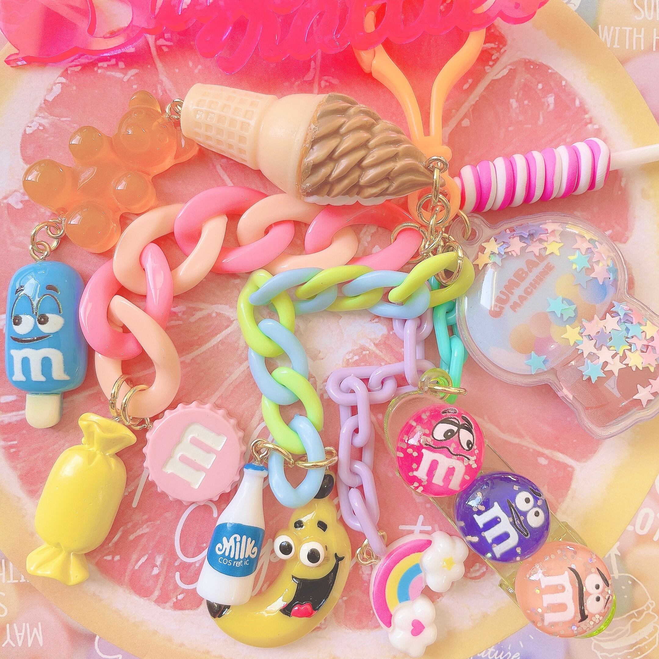 BIGサイズの立体ソフトクリームいろいろなお菓子チャームが揺れるプラチェーンキーホルダー。