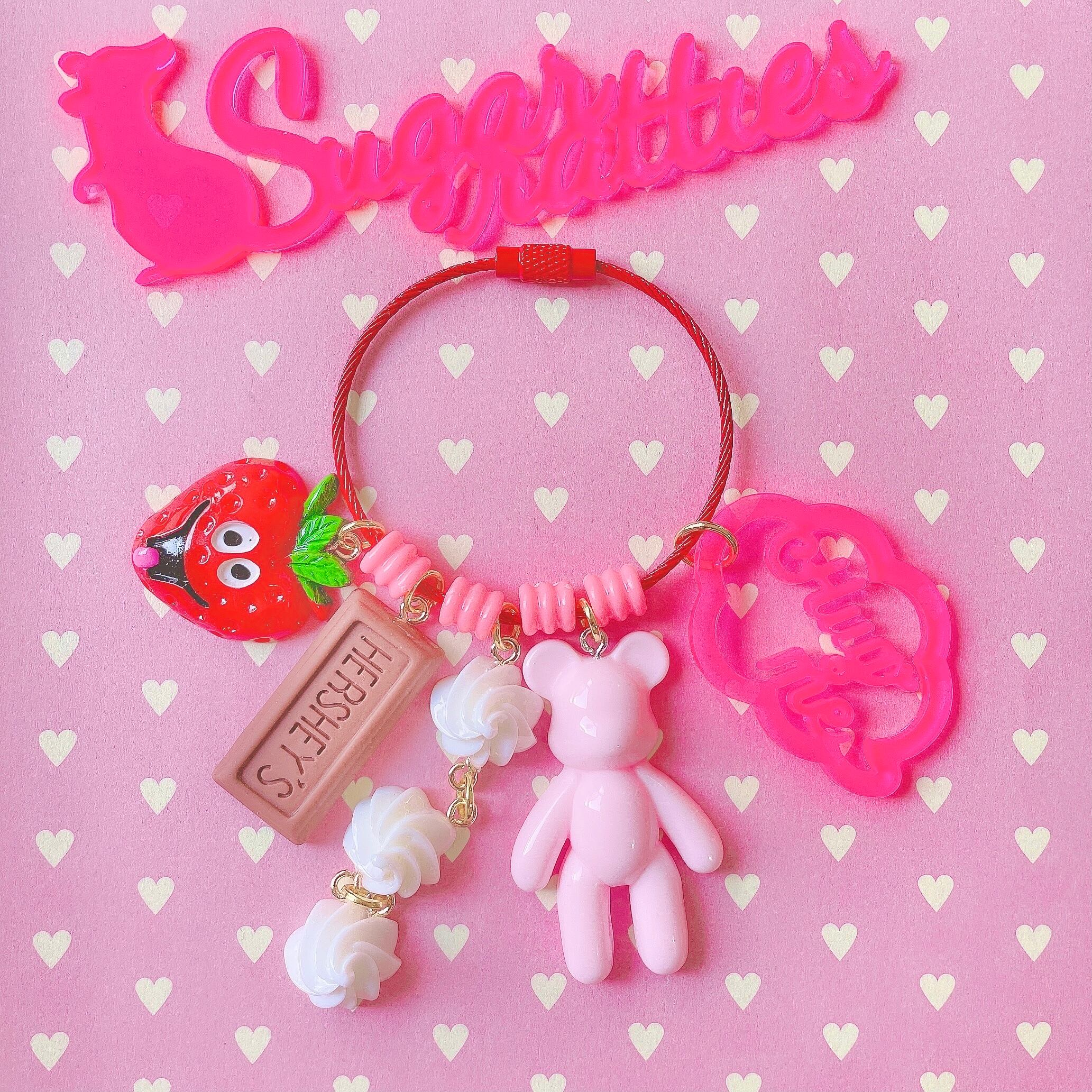 ストロベリーチョコみたいなベアチャームやFunnyなお顔のイチゴ、チョコレート、連なるホイップクリームが揺れるワイヤーキーリング。