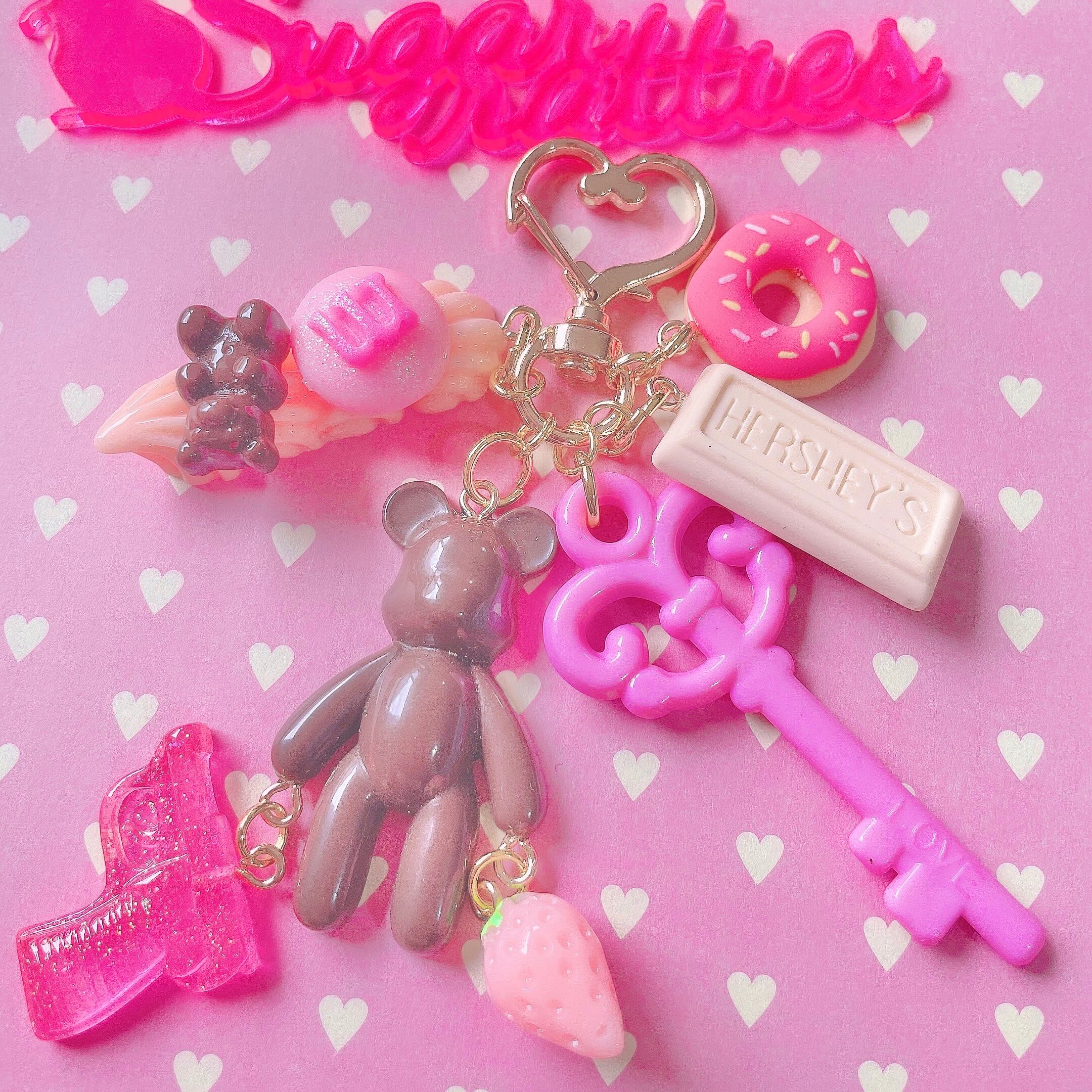 ピストルや苺を持ったチョコレートのクマ、mチョコとくまチョコをのせたチョコレートクリーム、ぴんく色の魔法の鍵、ドーナツチャームなどが揺れるキーホルダー。