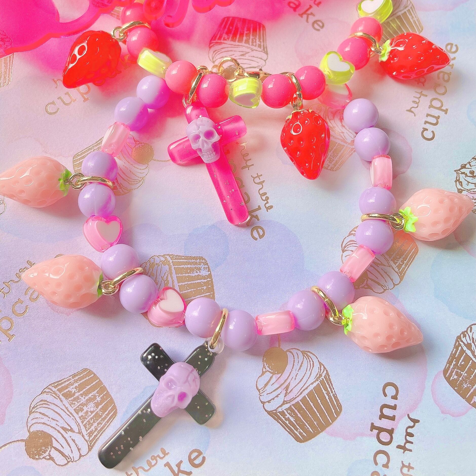 配色ビーズや苺チャームの甘い世界の真ん中に、ひとつ佇む髑髏と十字架で誰しもの心の奥底に潜む闇、それを浄化する祈りをイメージしています。
