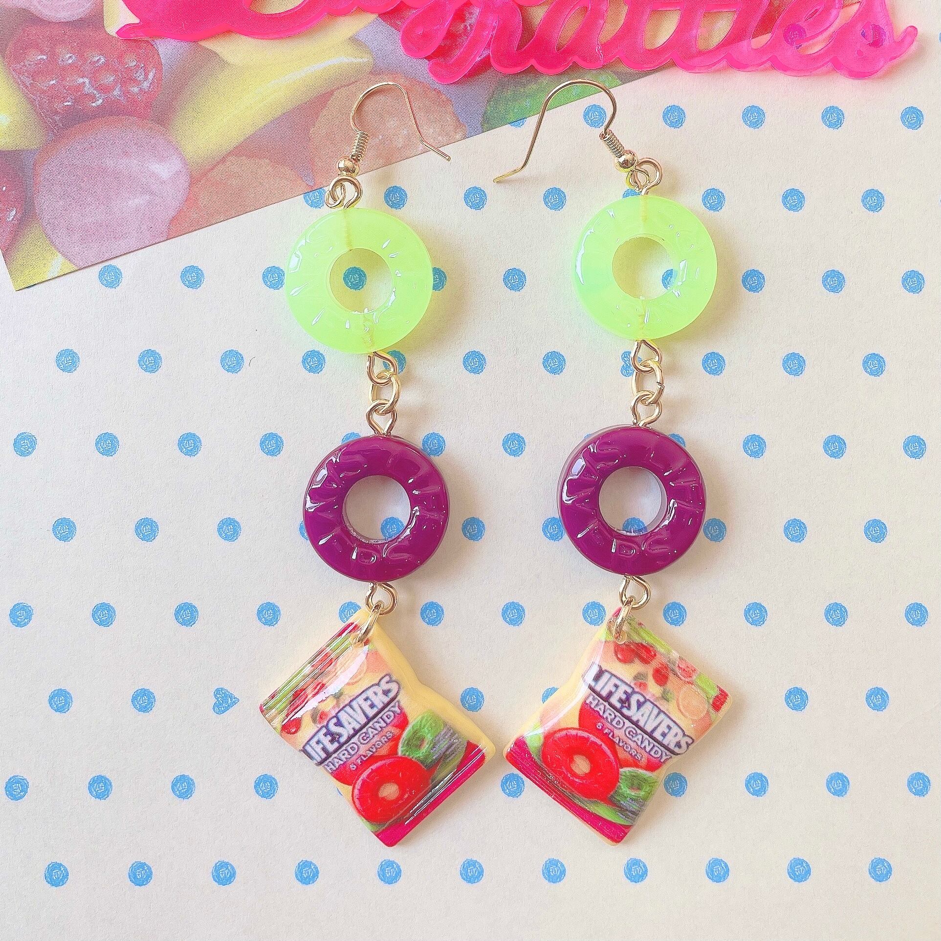 2種類のフレーバードロップキャンディとパッケージが連なるピアス。