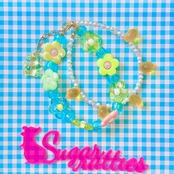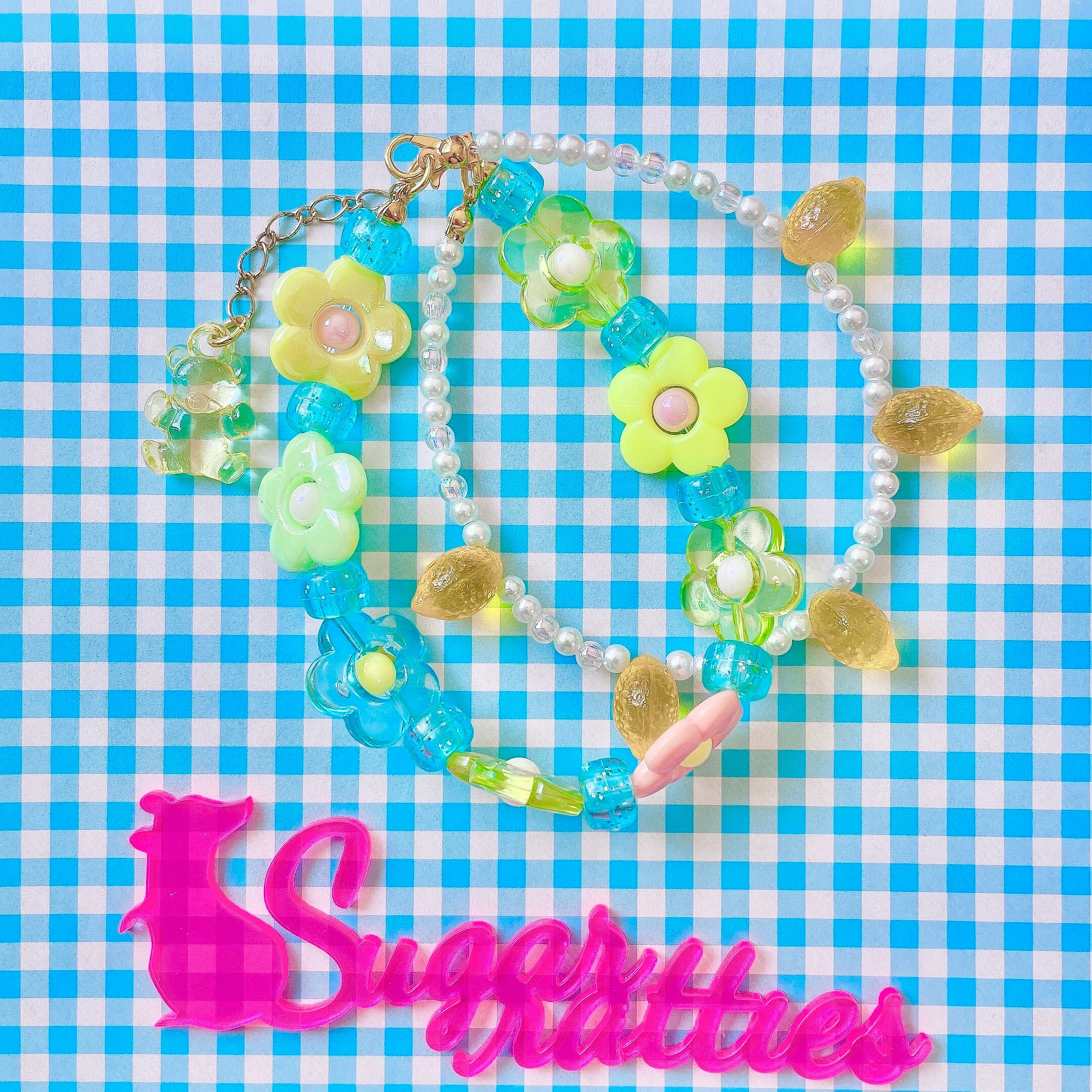5粒のレモンやイチゴがぶら下がったブレスレットとカラフルなお花が咲いたブレスレットの二連デザイン。