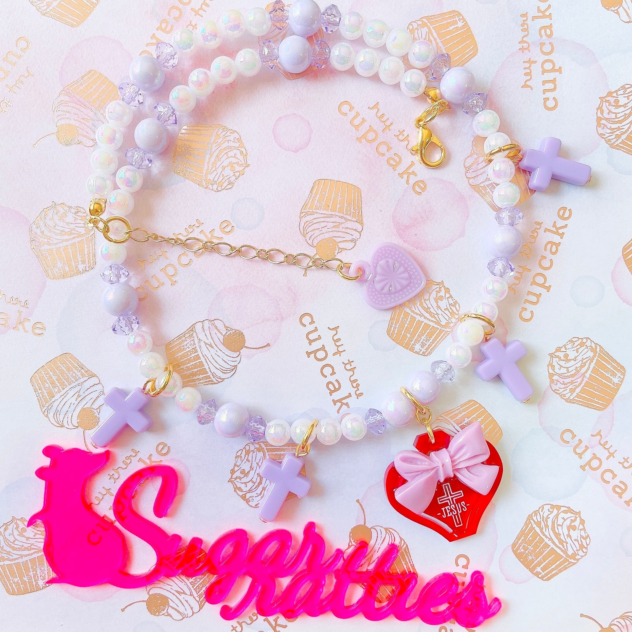 小ぶりなオーロラパールと淡いラベンダーカラーに、4つの十字架と真っ赤なハートの香水瓶が際立ちます。