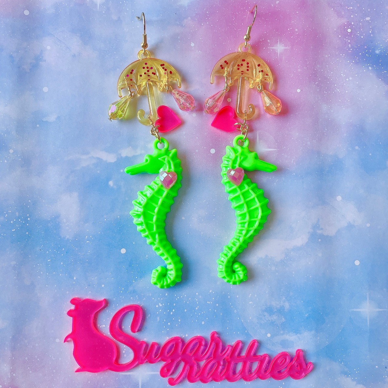 クリアカラーの傘から、オーロラに煌めく雨粒のようなドロップビーズ、カラフルなタツノオトシゴが揺れ動くピアス。