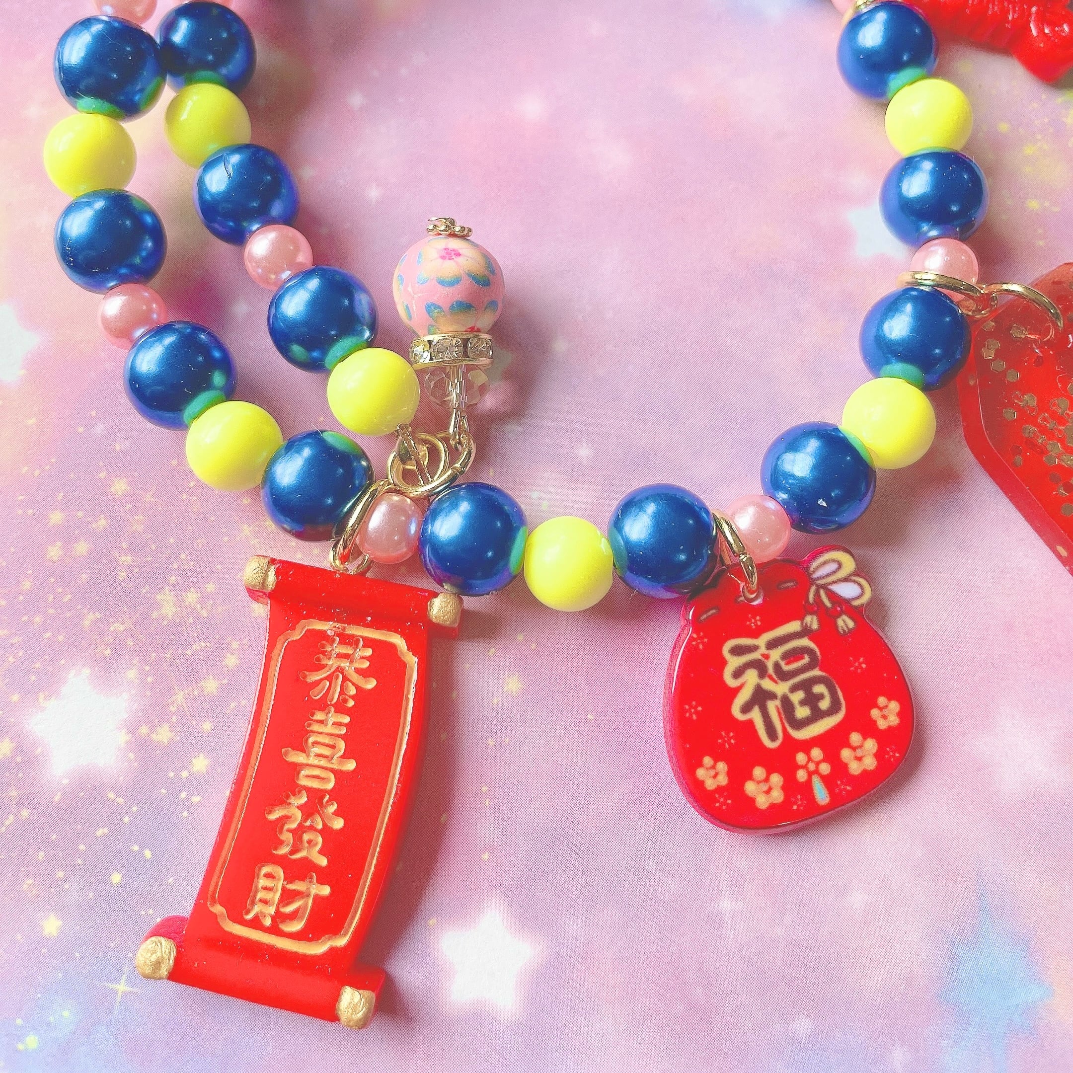 麻雀文字のレジン製御守りチャームと4つの縁起物チャームが揺れる、カラーパールの首飾り。