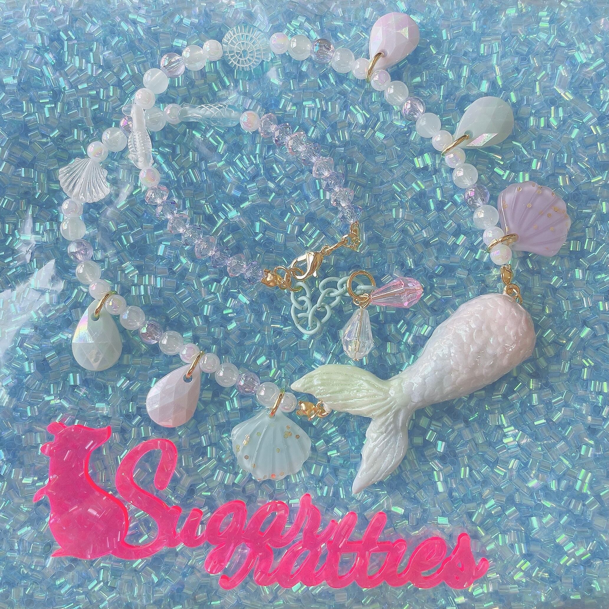 小粒のオーロラパールや多面カットビーズ、貝殻ビーズを繋げた人魚の首飾り。