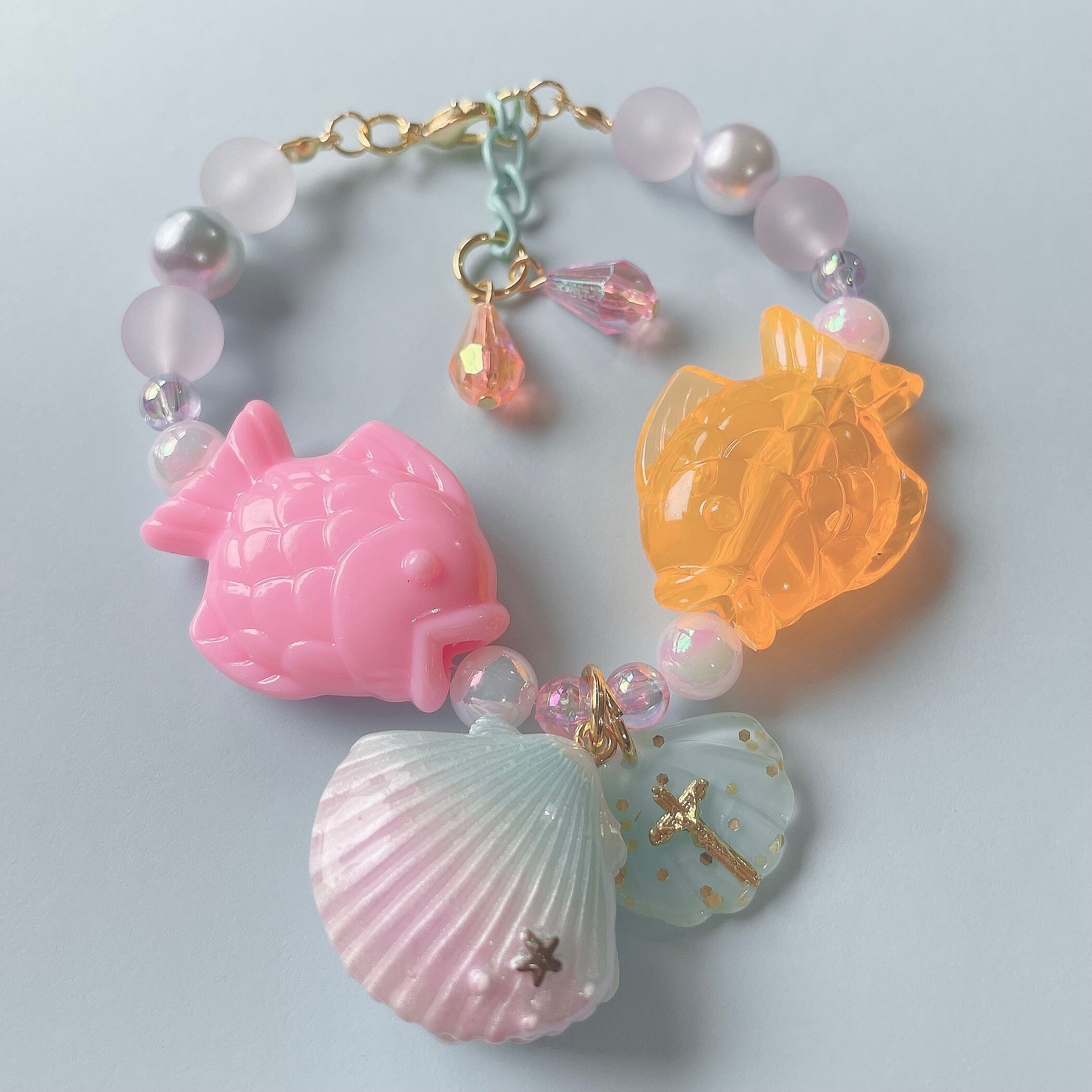 首飾りと同様、オーロラに煌めく貝殻マカロンと、その両側を飾るBIGサイズのお魚が手首の半周を飾ってくれます。