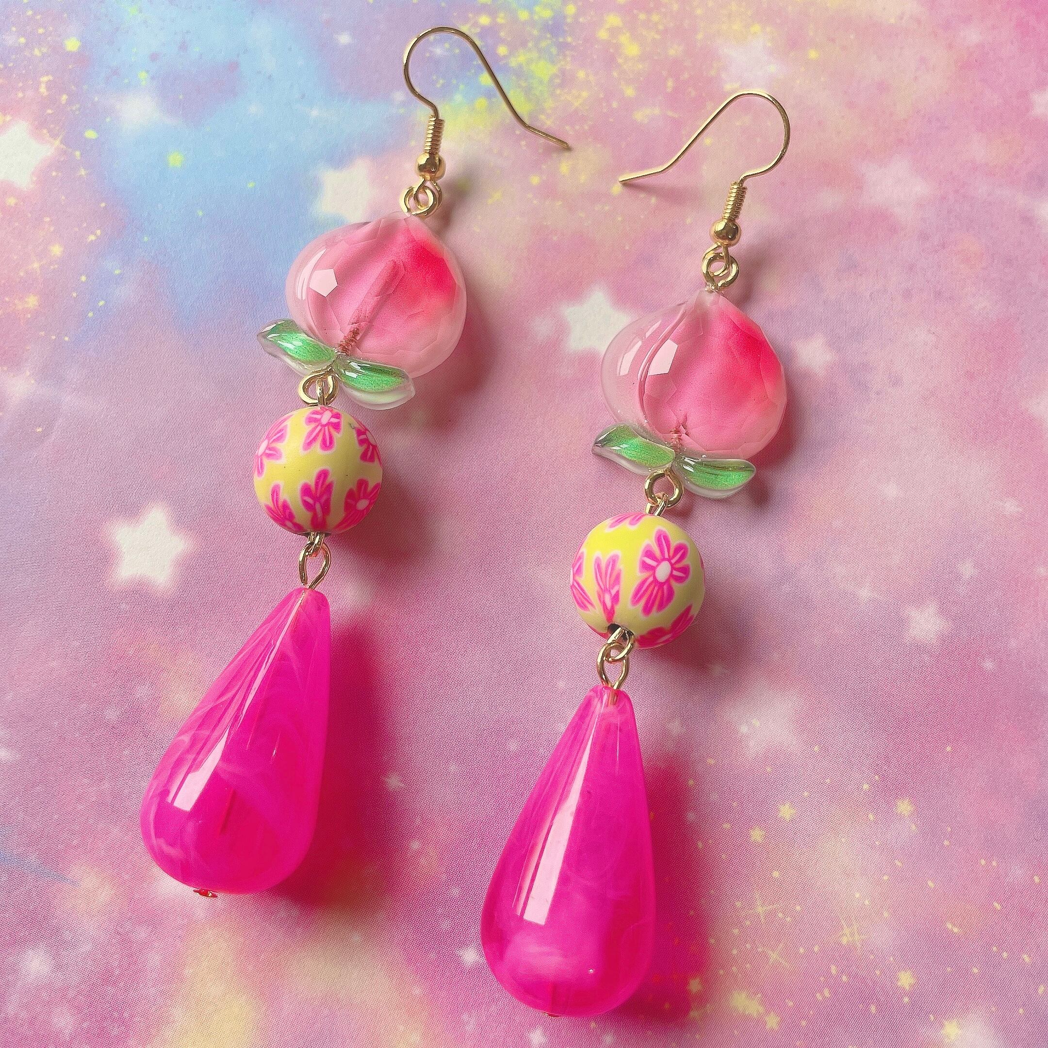 うる艶な多角の桃から花柄のクレイビーズ、大粒の雫が連なり揺れる耳飾り。