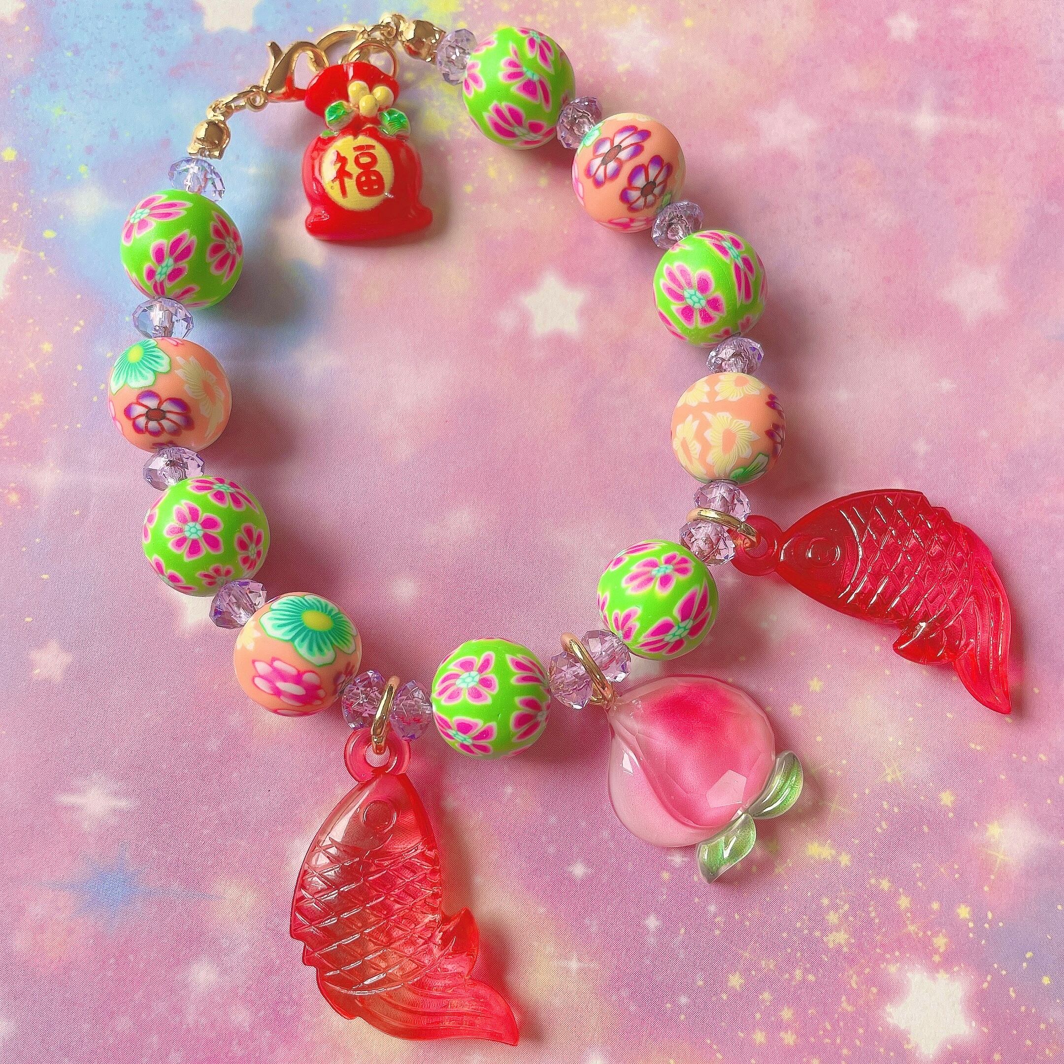 3つのチャームが揺れるクレイビーズのブレスレット。