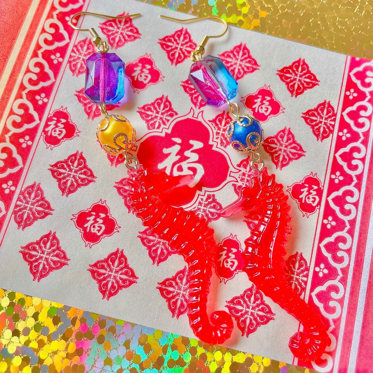 妖艶な煌めきのスクエアビーズからタツノオトシゴが連なり揺れる耳飾り。
