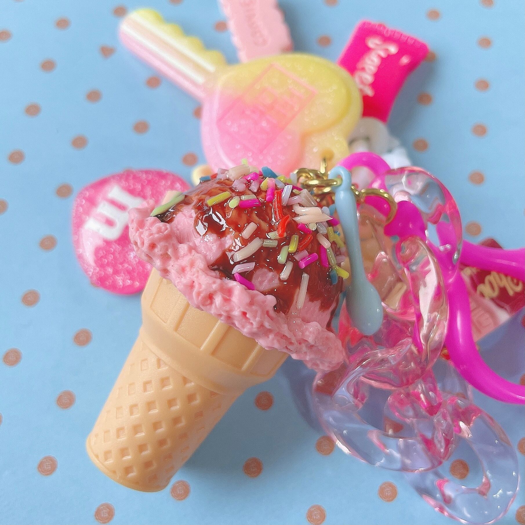 チョコレートソースたっぷりのストロベリーアイスクリームのじゃらじゃらキーホルダー。
