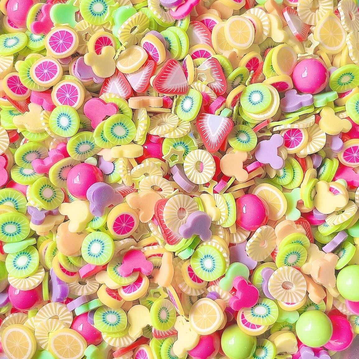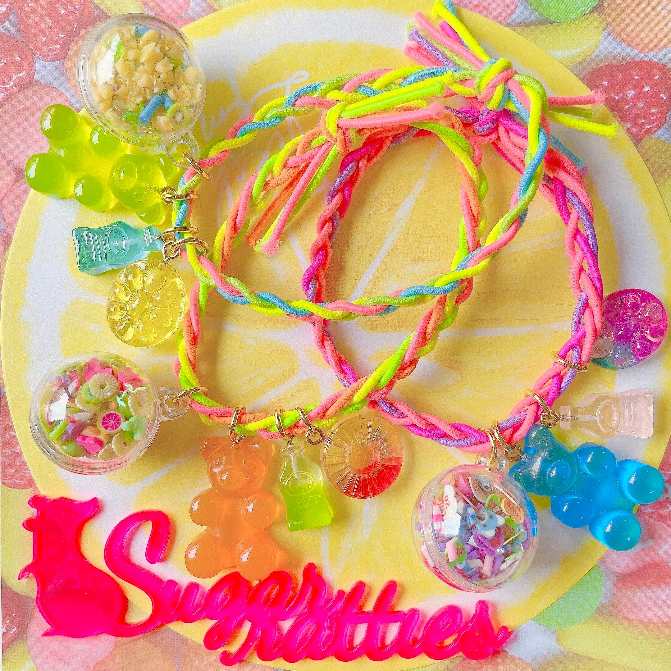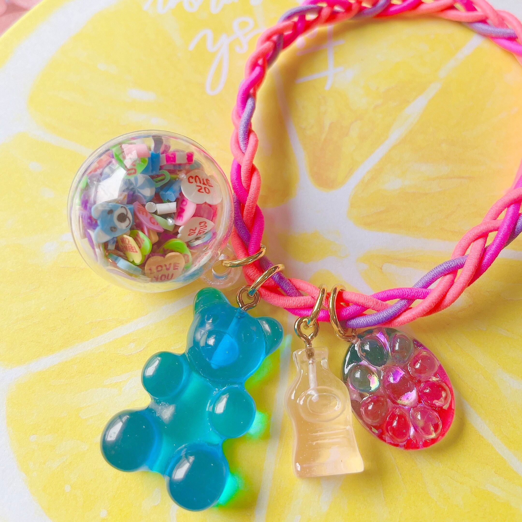 らっとmixフレークを詰め込んだカプセルや、BIGサイズのくまグミ、ドリンクボトル、ドロップキャンディが揺れるヘアゴムブレスレット。