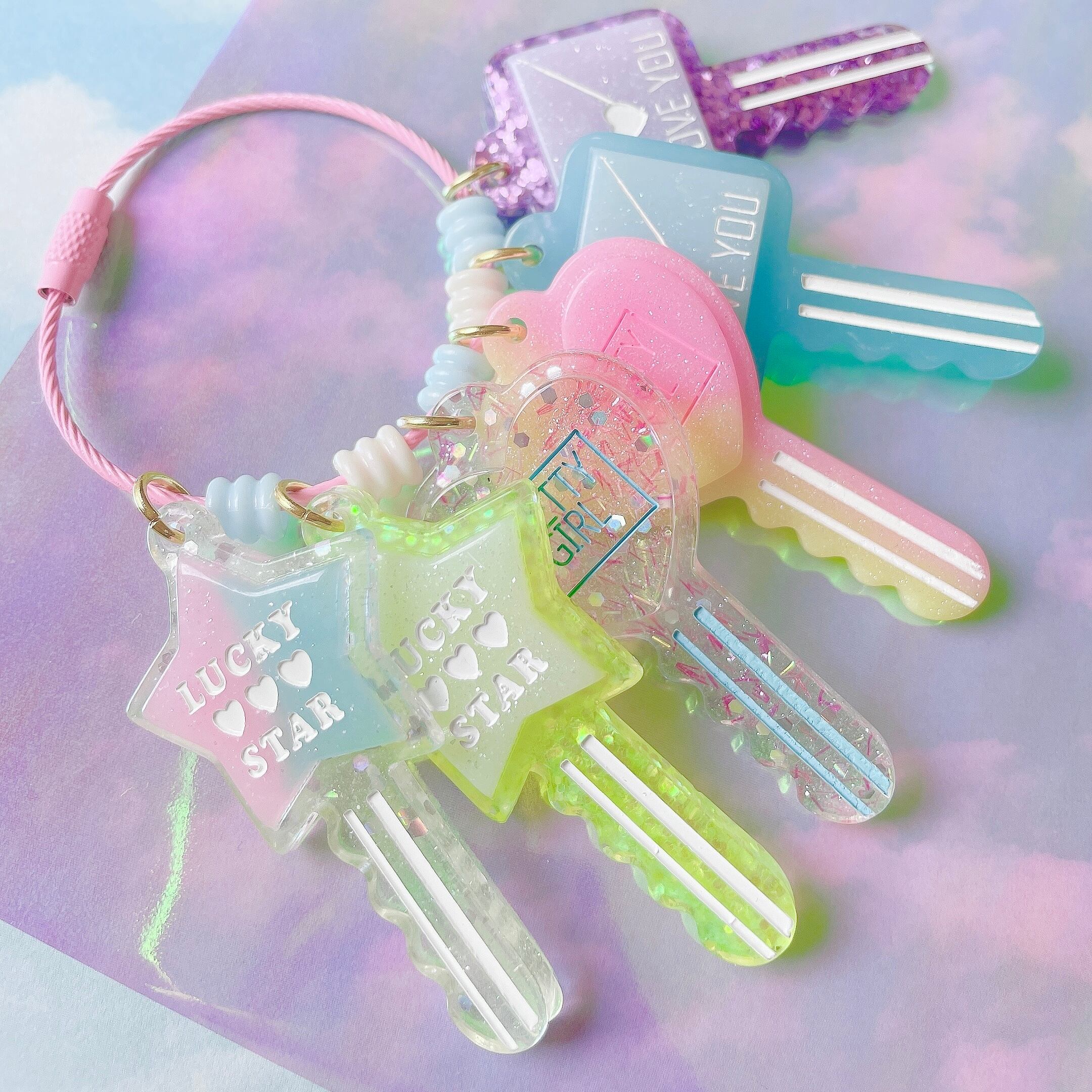 ピンク色のワイヤーに6本の鍵が揺れるワイヤーキーリング。