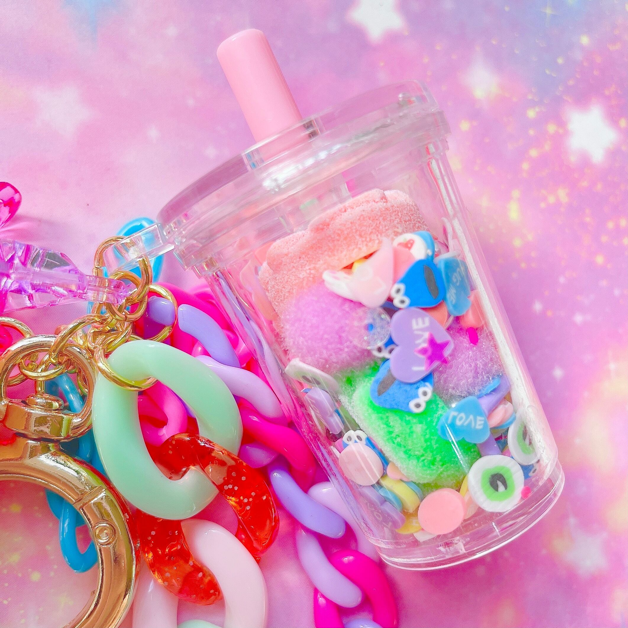 ザラメグミみたいなドーナツ2つとオリジナルブレンドのフレークを詰め込んだドリンクカップのキーホルダー。