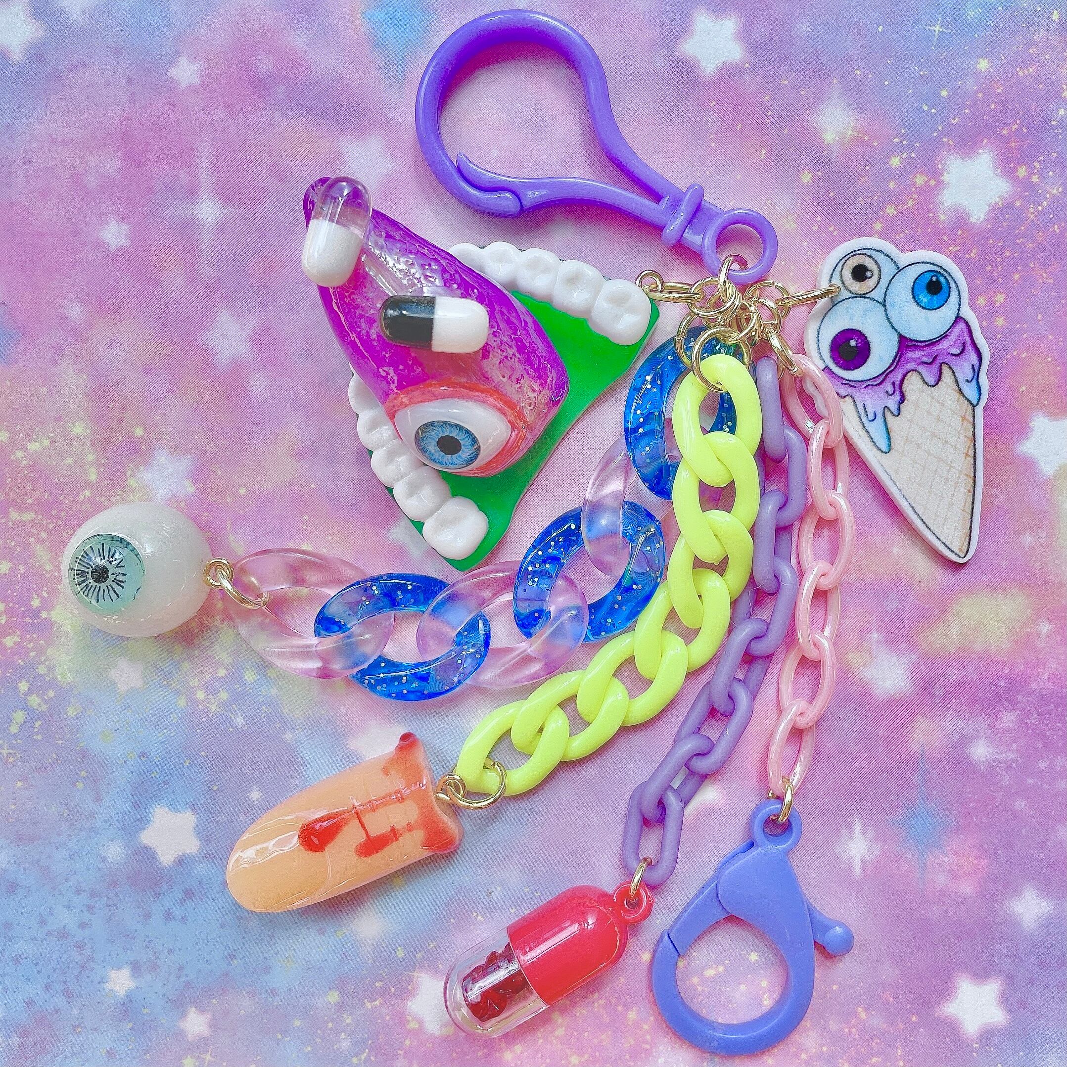 眼球、指、お薬カプセルが揺れる4本のプラチェーンと、眼球盛りなワッフルコーンも付いたじゃらじゃらキーホルダーです。