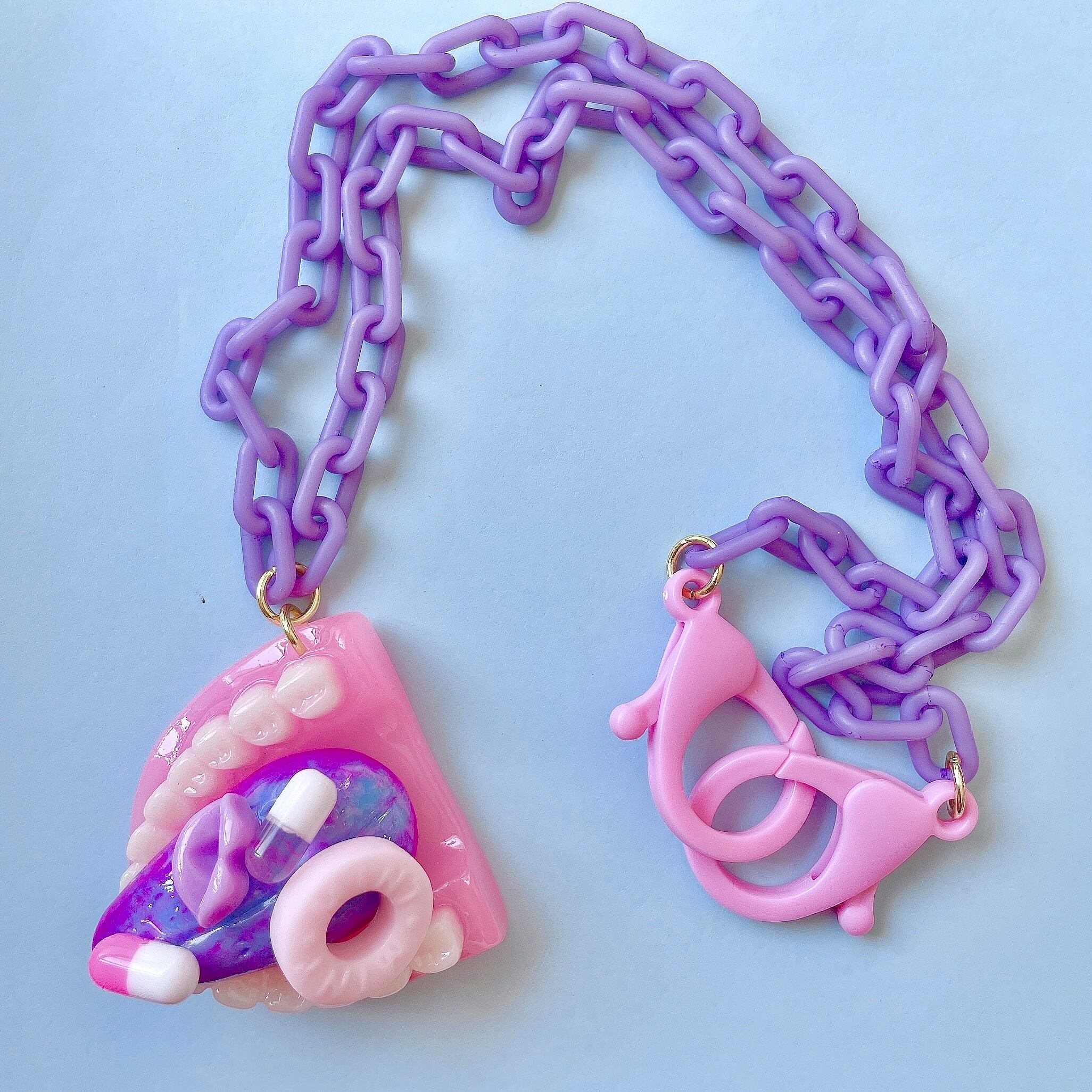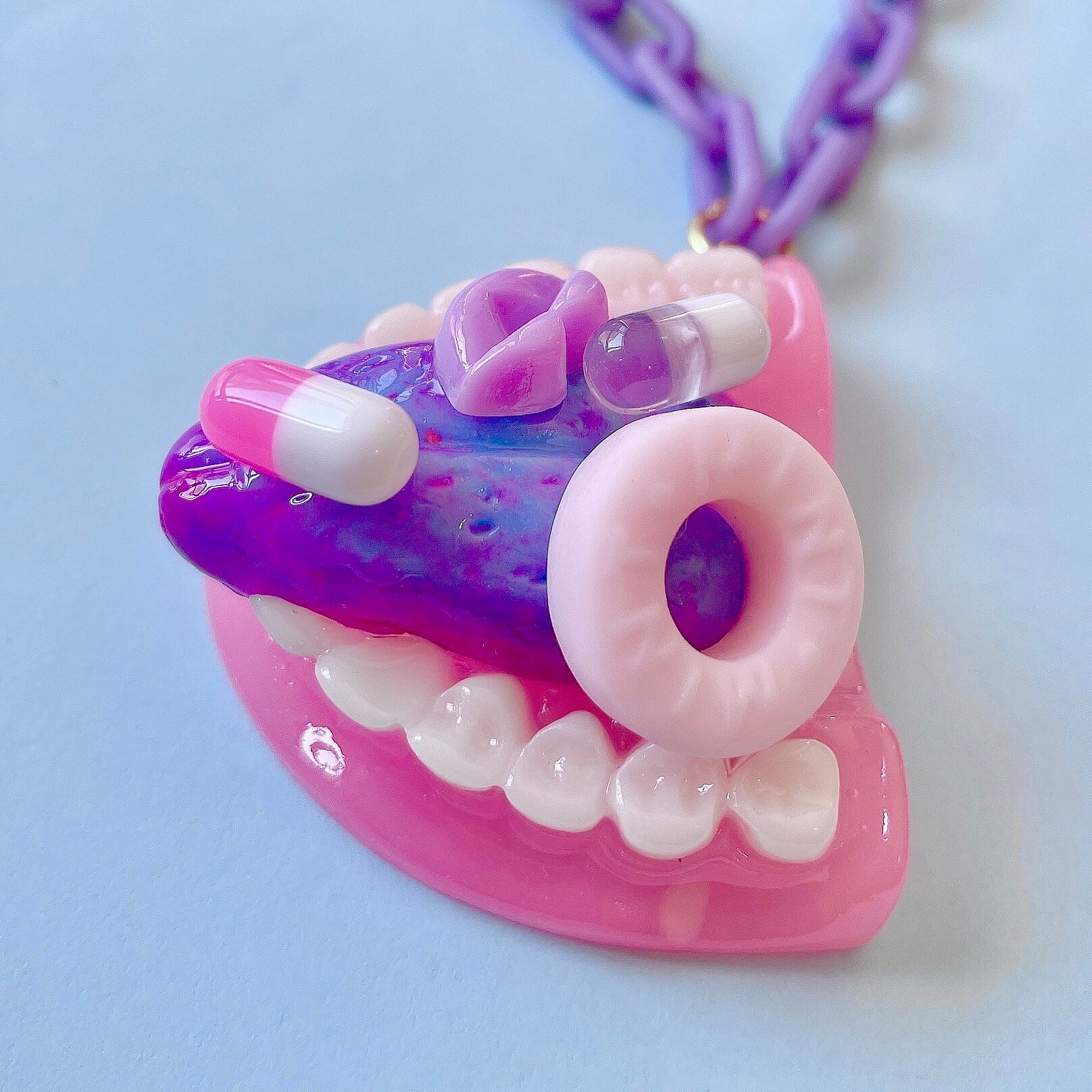 お口からべろっと伸びでた舌の上にたくさんのお薬がのったプラチェーンネックレス。