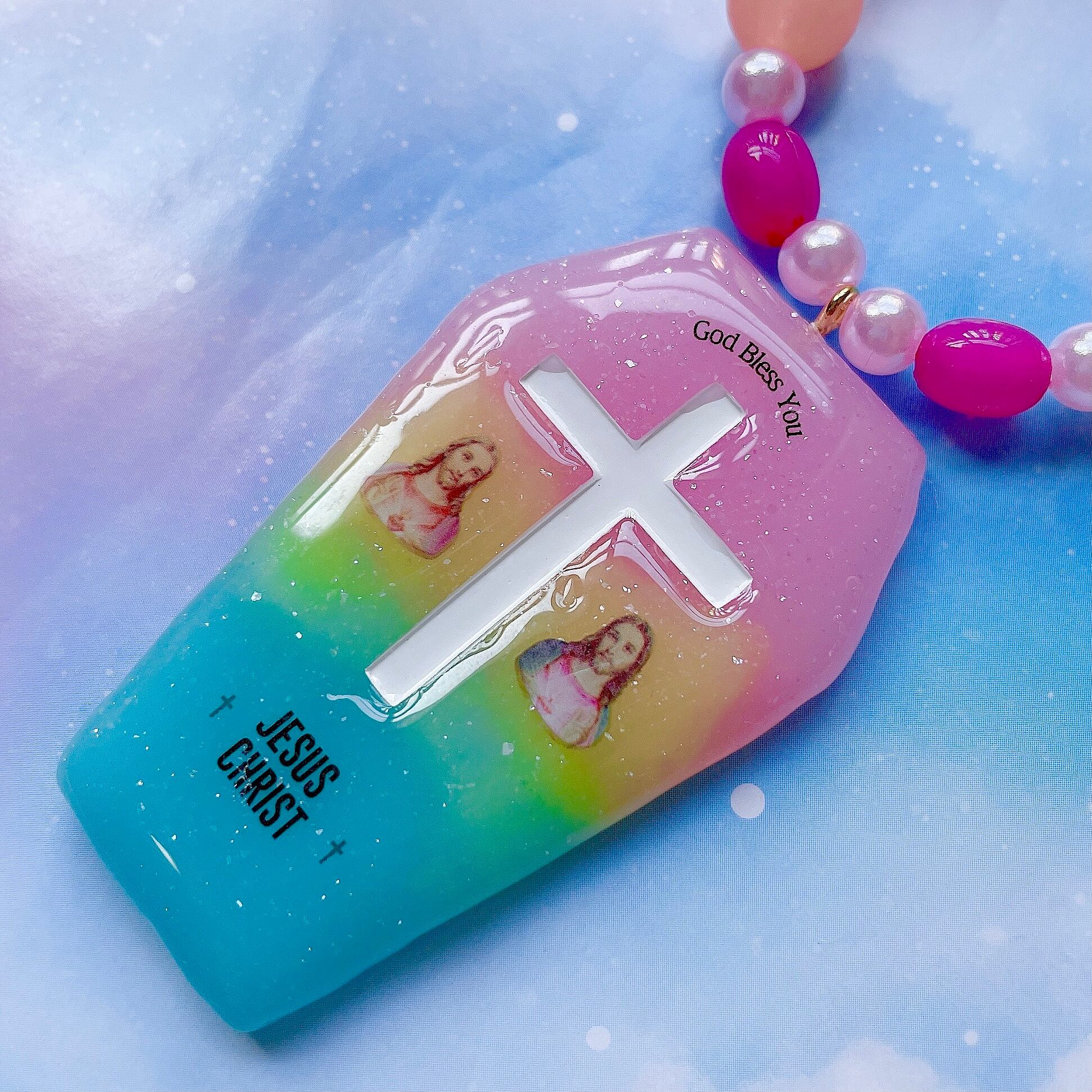 キャンディカラーの棺桶にはキリストの絵柄を施し、蓄光タイプのビーズやジェリービーンズのようなビーズを連ねました。