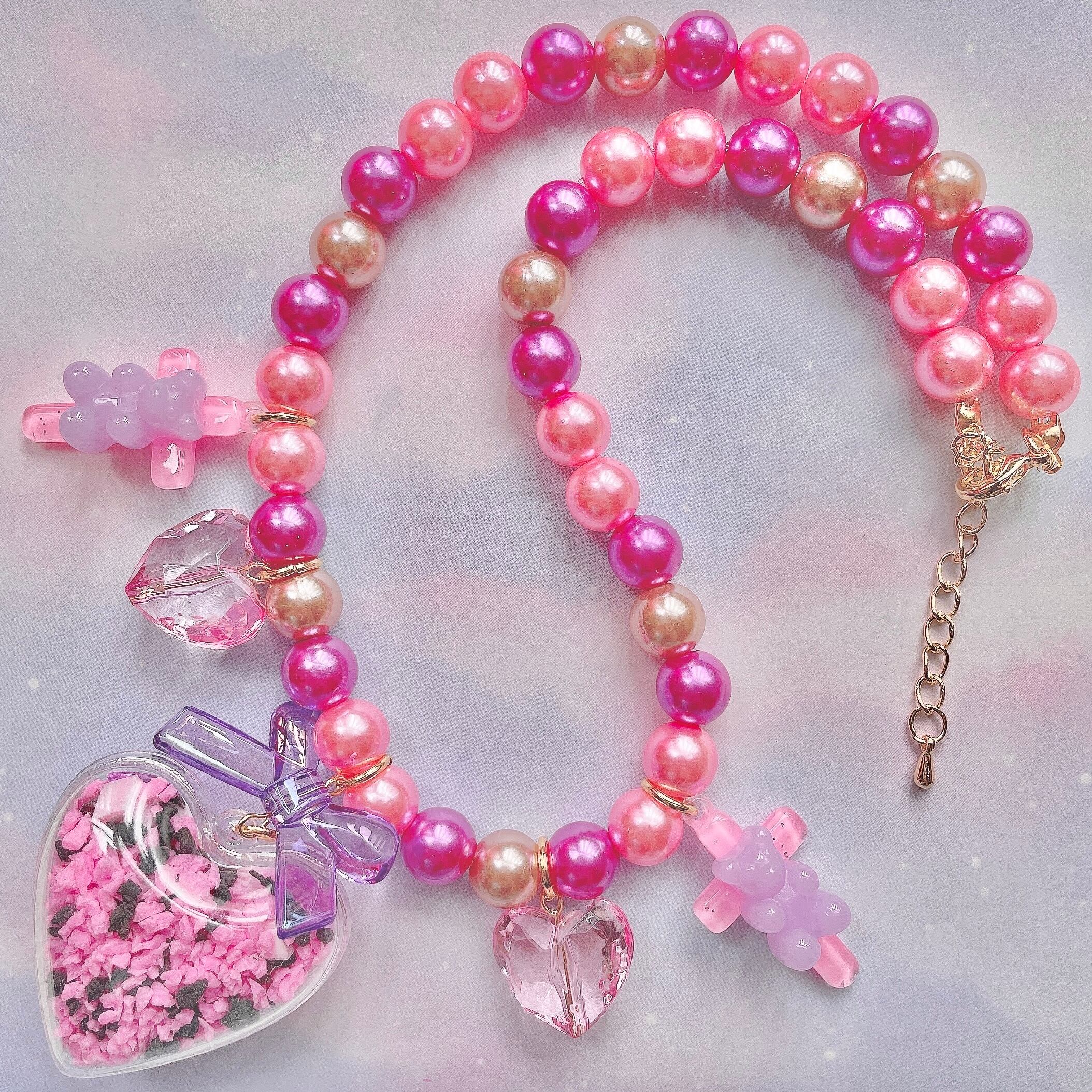 砕いたチョコレートやキューブ型のいちごみるくチョコレート、ハートのキャンディ…お菓子の欠片を詰め込んだようなハートのカプセルが揺れるビーズネックレス。