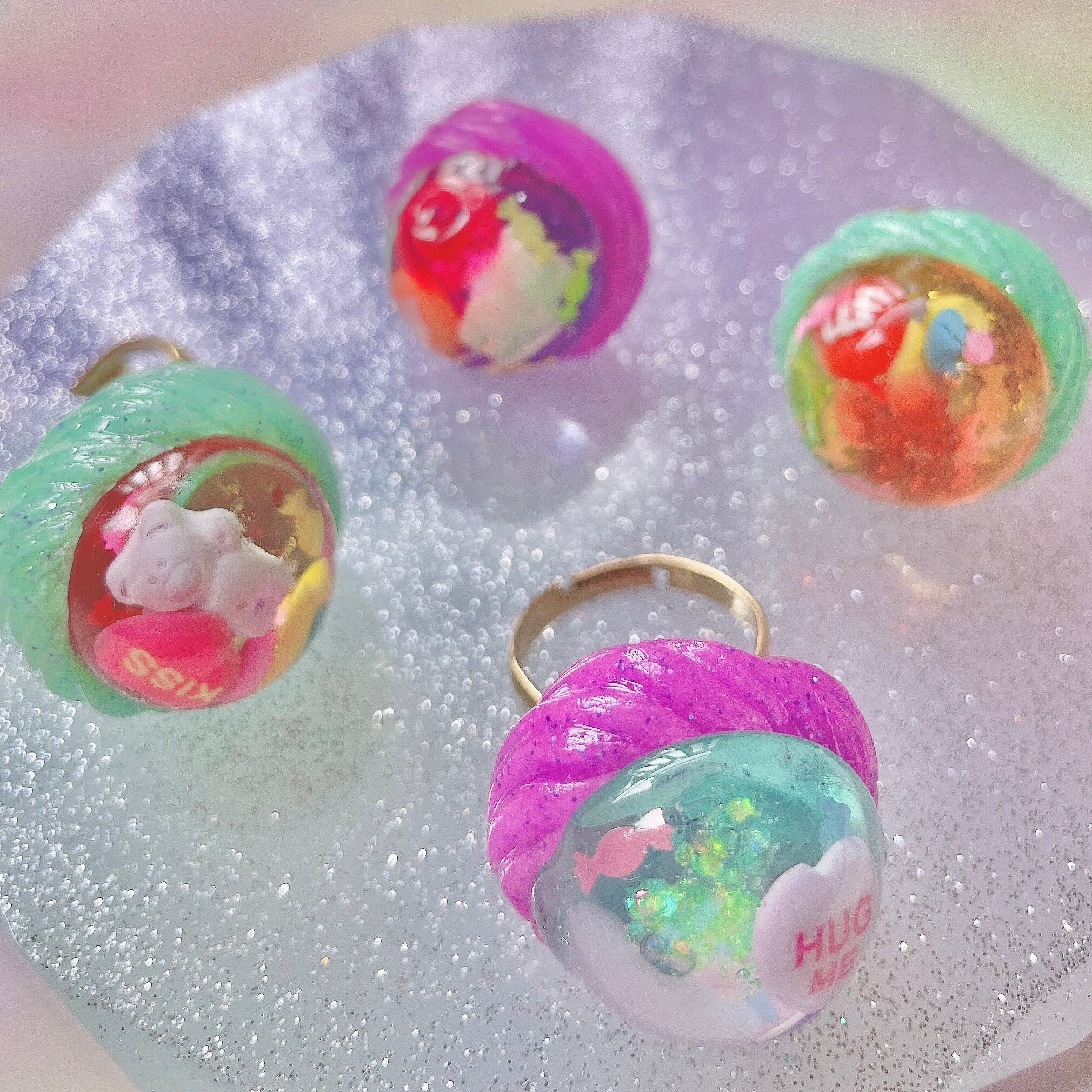クマラムネ、くまグミ、ゼリービーンズ、mチョコ、ねじりマシュマロなどいろいろなお菓子とスパンコールやラメ、ホログラムを閉じ込めたキャンディみたいなリング。