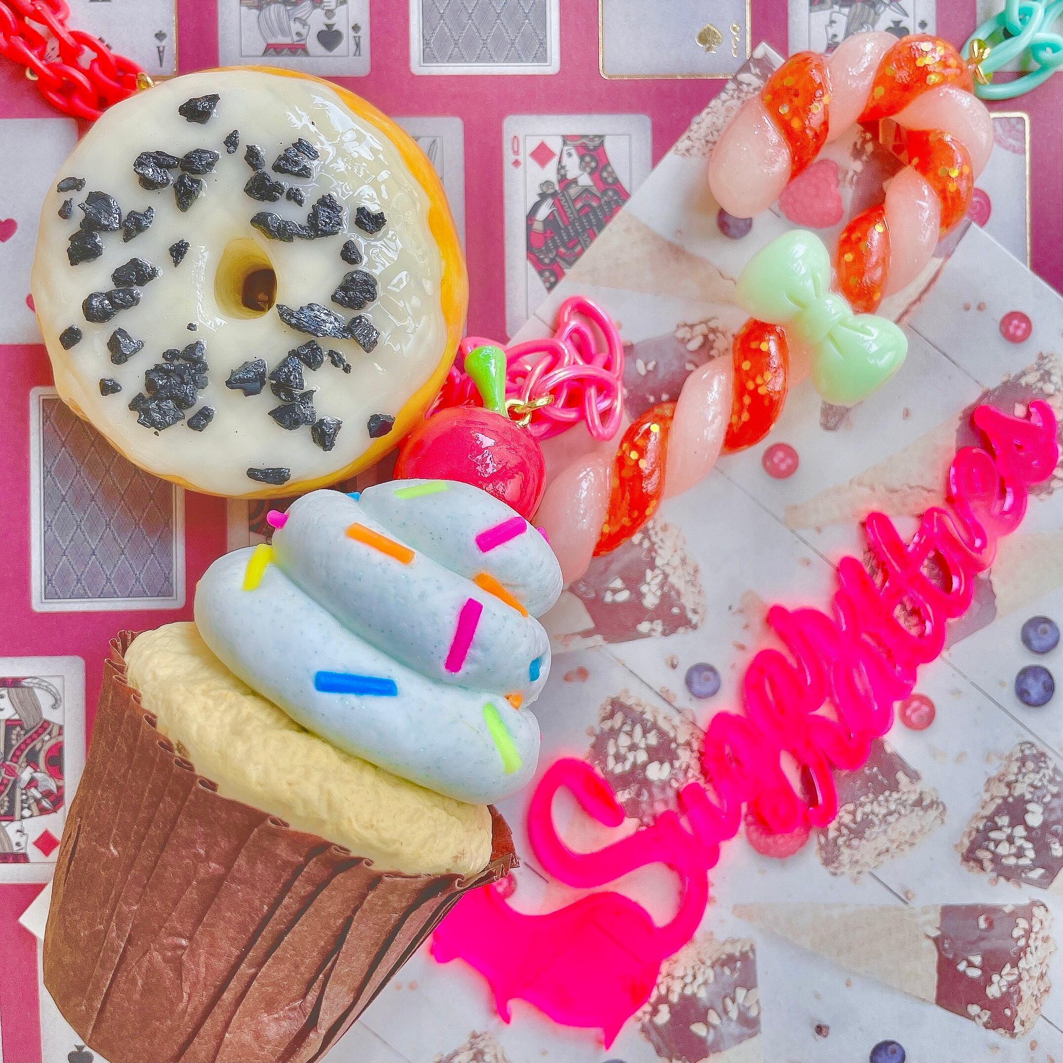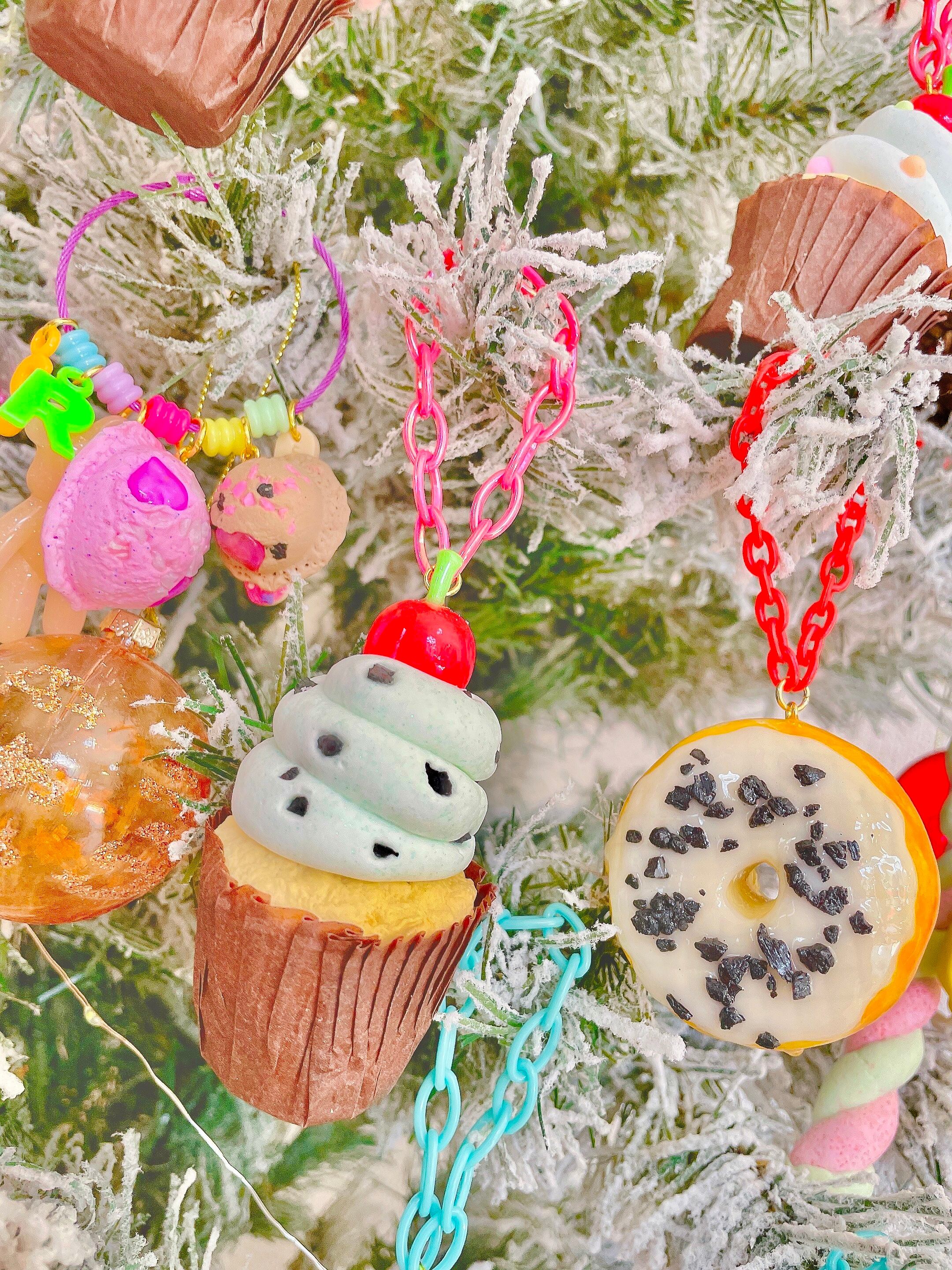 ねずみの手作りドーナツ、カップケーキ、ステッキキャンディの3種がセットになったオーナメントセット。