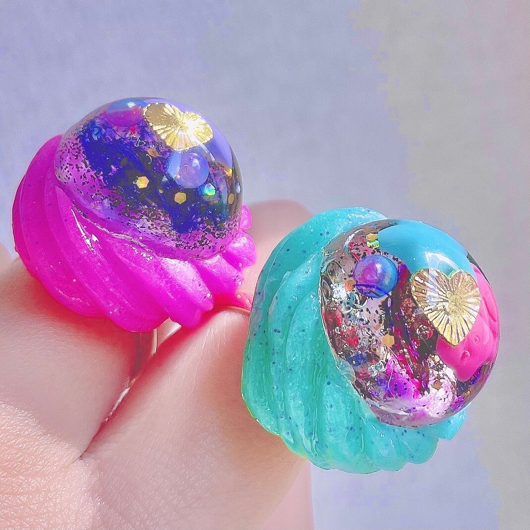 ハートのメタルパーツや星、パール、引き揃え糸をホロやラメと一緒に閉じ込めたキャンディみたいなリング。