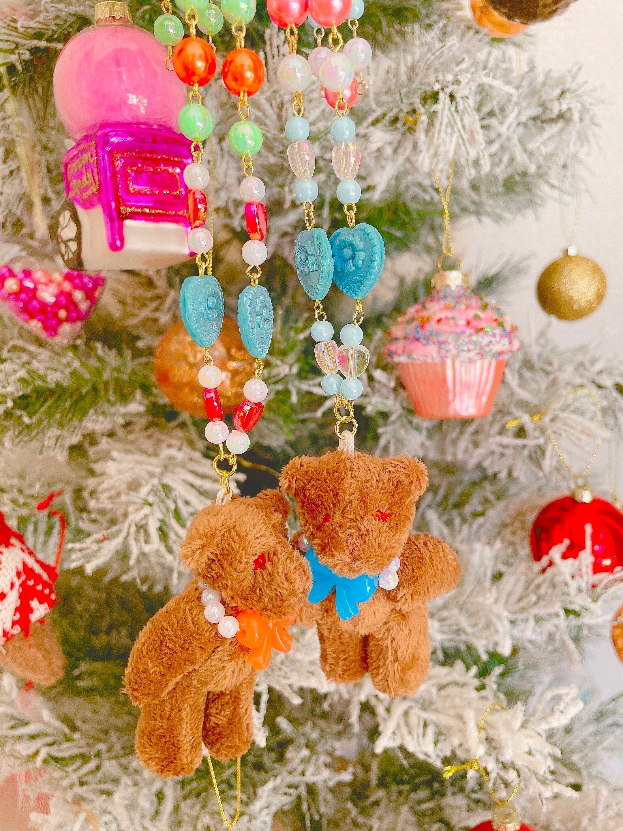 リボンの首飾りを付けた赤いおめめのテディベアが揺れる、ロングビーズネックレス。