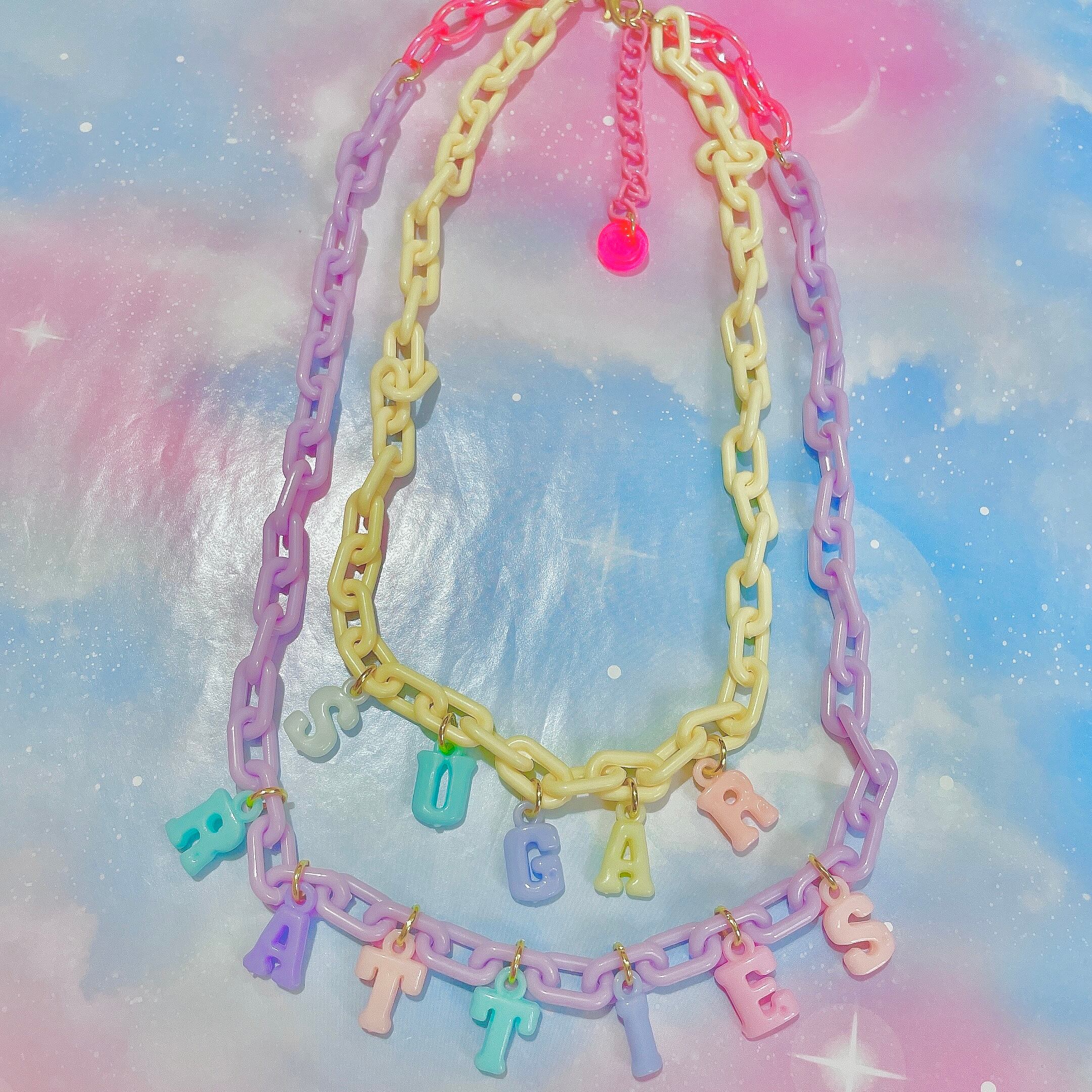 2色のチェーンにパステルカラーのSUGAR RATTIESロゴが揺れ動きます。