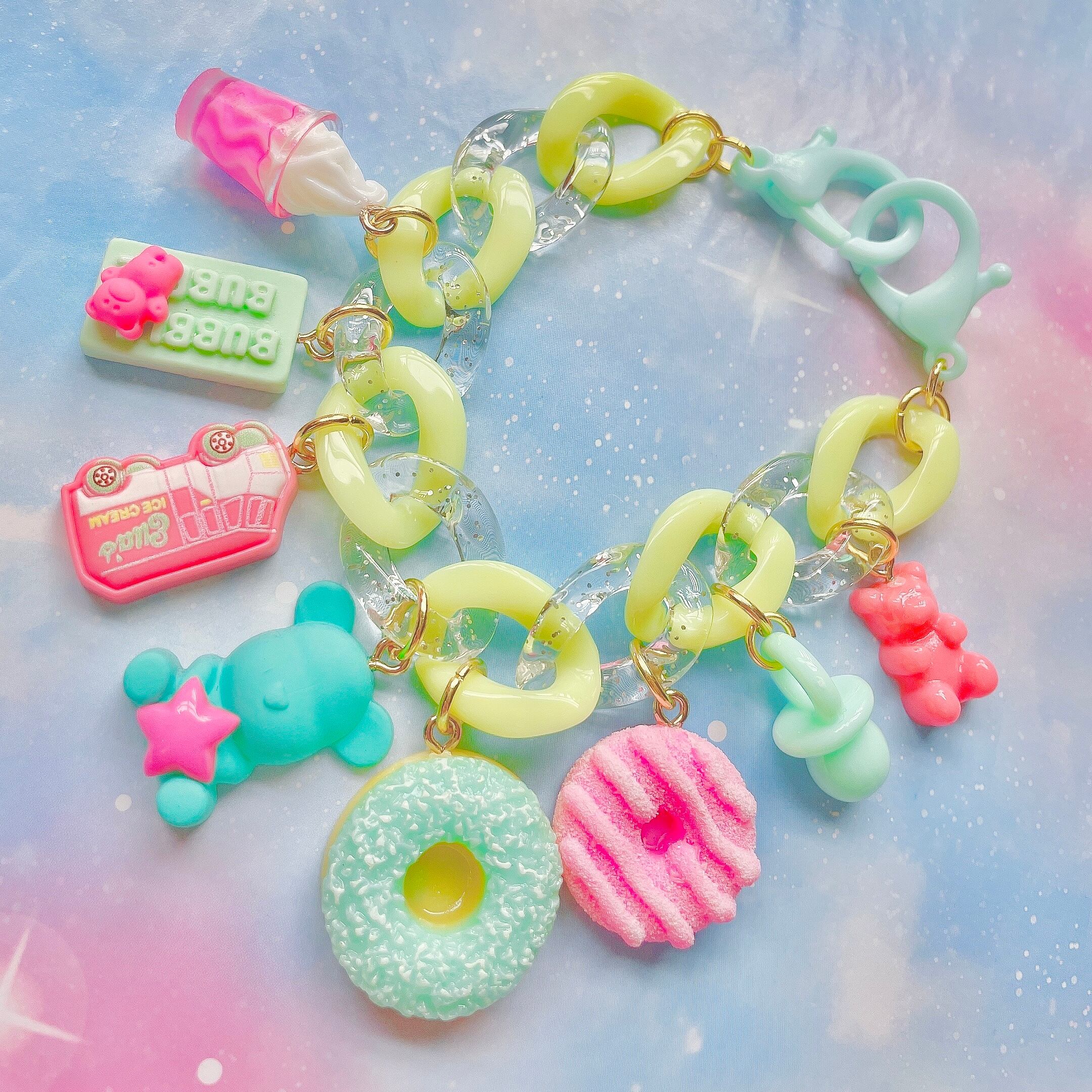 ピンクのお星さまを抱えたミントカラーのくまと、7つのちゃーむが揺れる2wayプラチェーン。