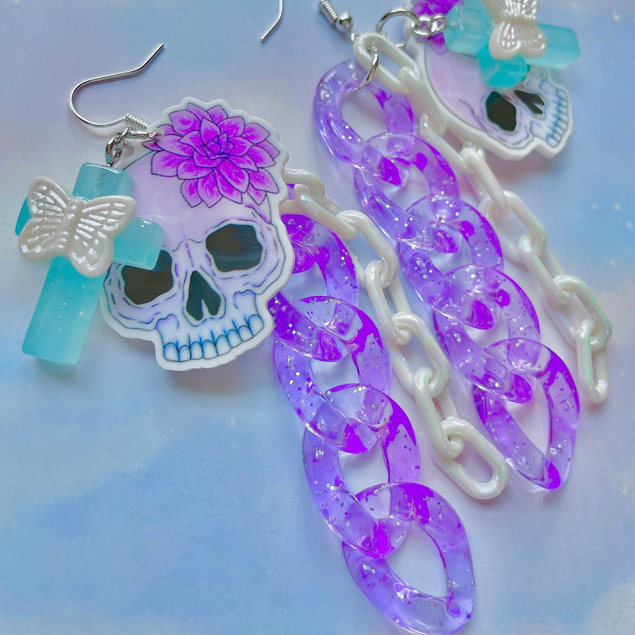 髑髏、蝶々で飾った十字架、2本のプラチェーンが揺れるピアス。