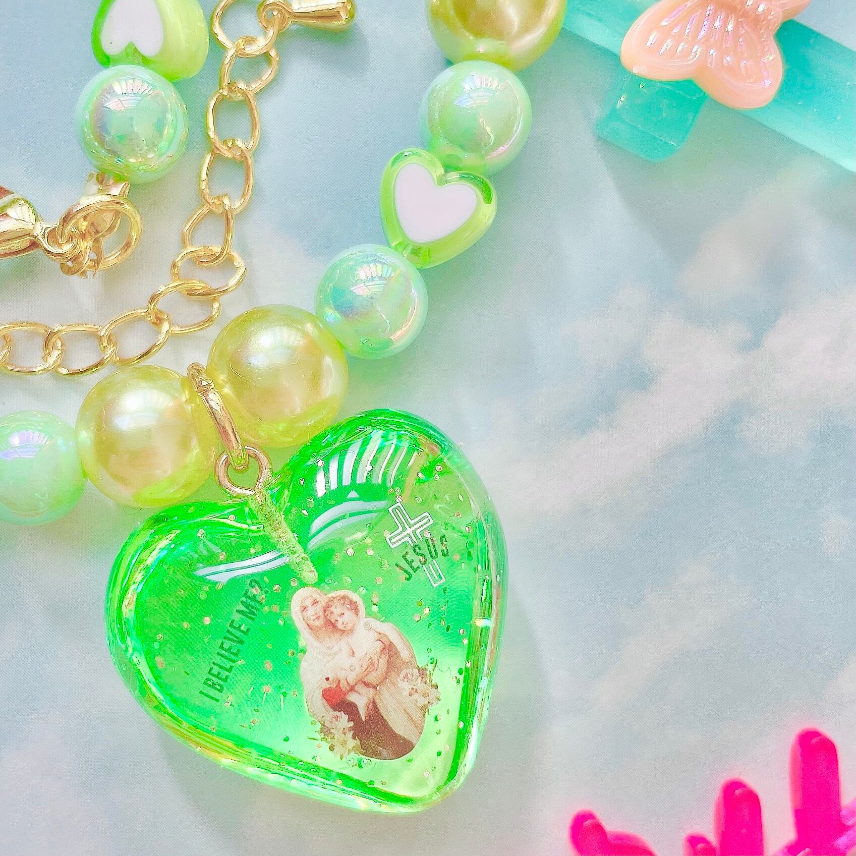 マリア様にラメが煌めくうる艶ぷっくりハートと蝶々がとまった十字架、多角ハートが揺れるパールビーズネックレス。