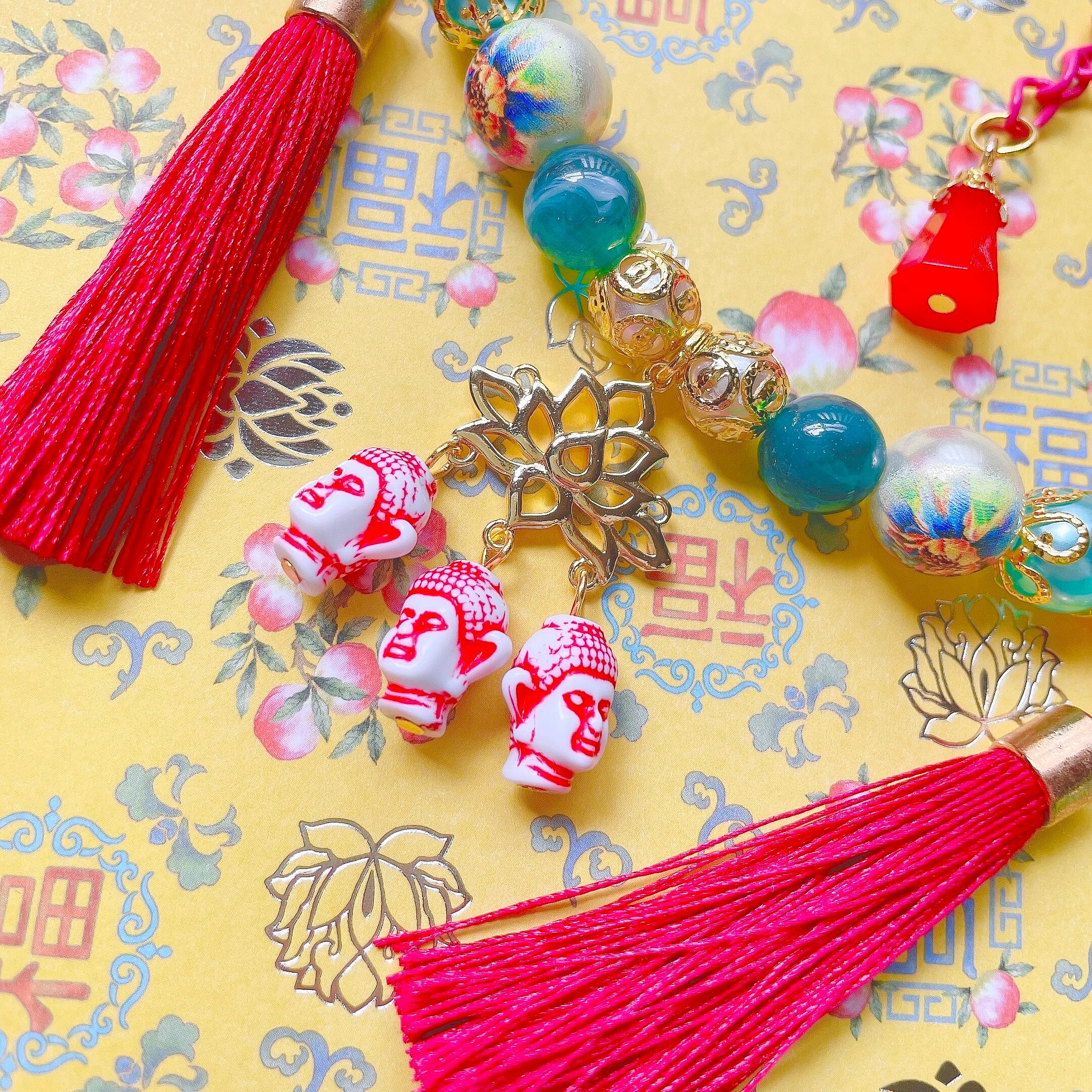 赤を貴重にしていますが、差し色に水色を組み込んでいるので、同シリーズの小さな大仏様の耳飾りとセットで身に付けるのもおすすめです。