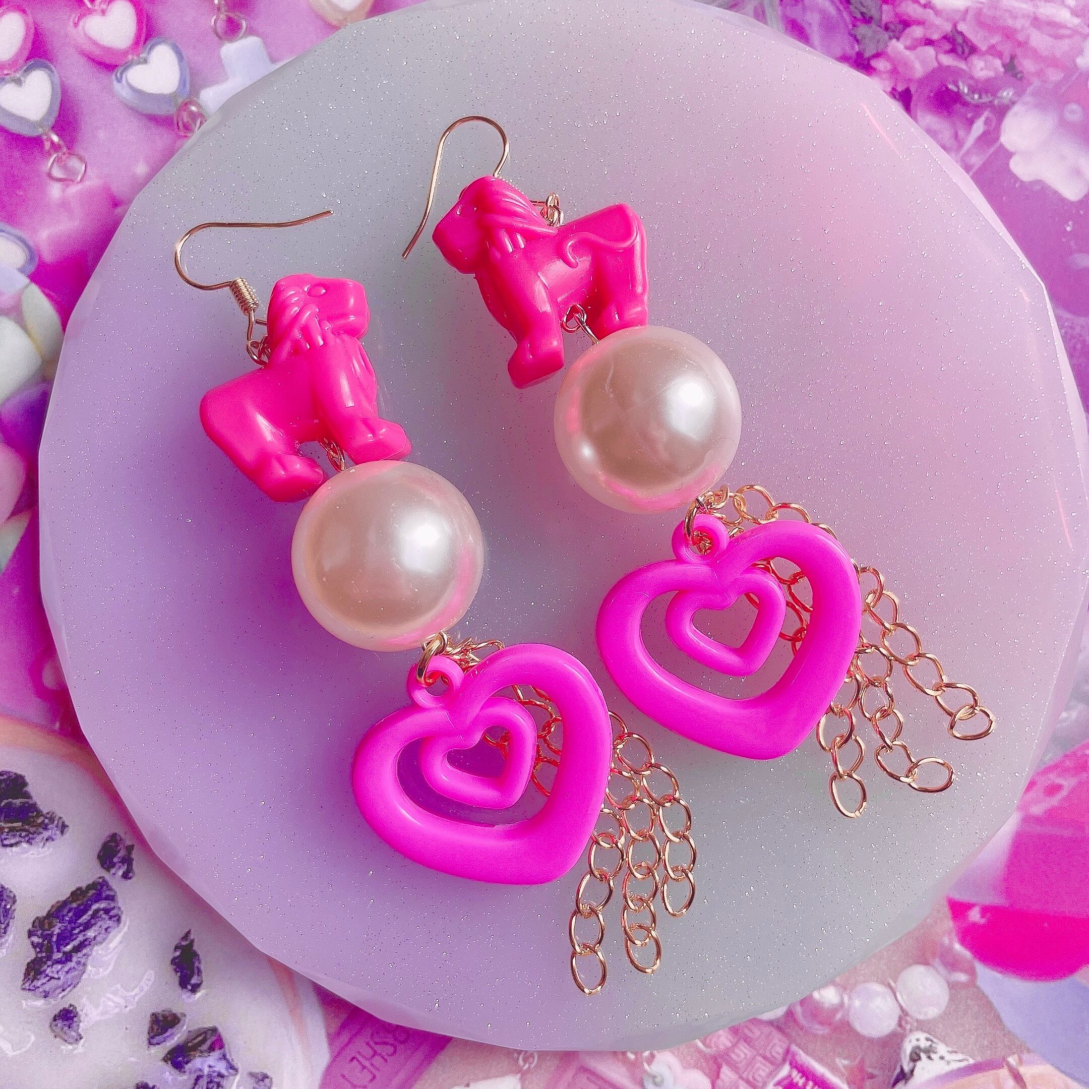 ピンクのライオンに大玉パール、ダブルハートとゴールドチェーンが揺れるバブリーなピアス。