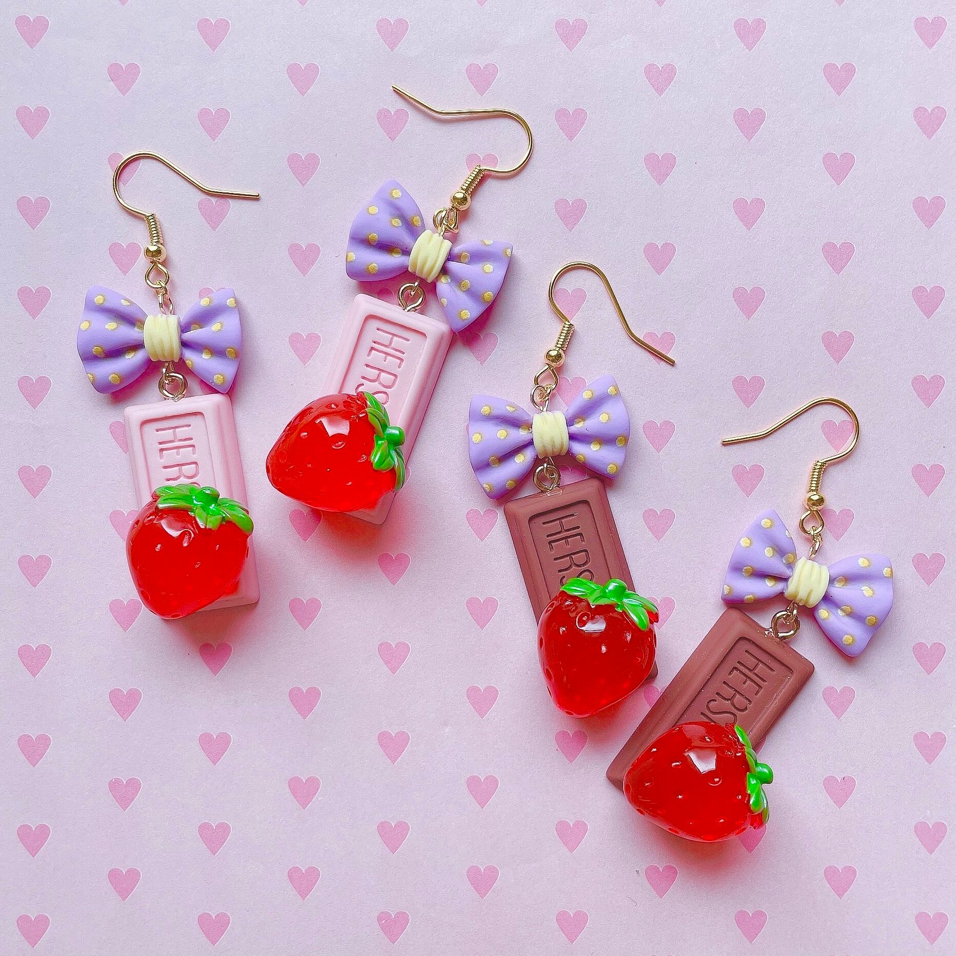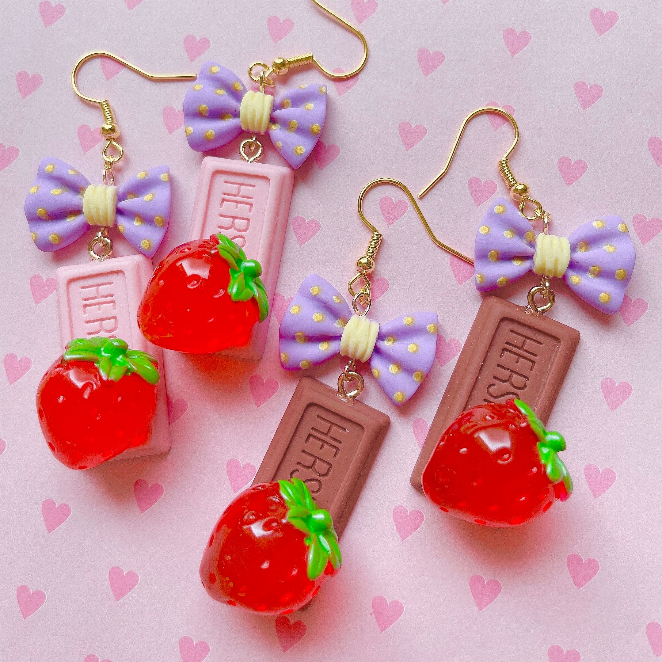 クリアな苺がのせた甘いチョコレートをちょっぴり大人なラベンダーカラーのリボンで飾ったピアス。