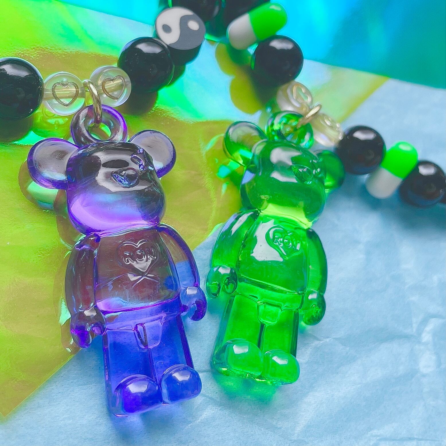 ブラックボールにネオンクロスのスクエアビーズ、陰陽マークやお薬カプセルを挟んだクリアなくまが揺れるビーズネックレス。