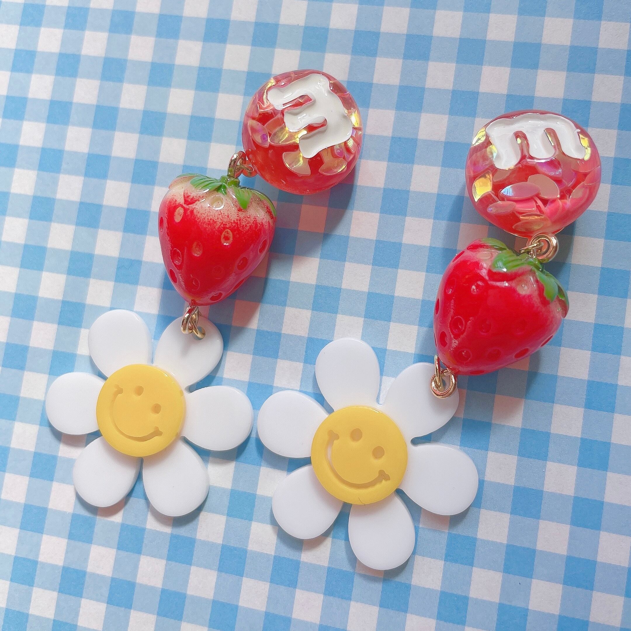 キラリぷっくりなmチョコから苺とニコちゃんフラワーが揺れるピアス。