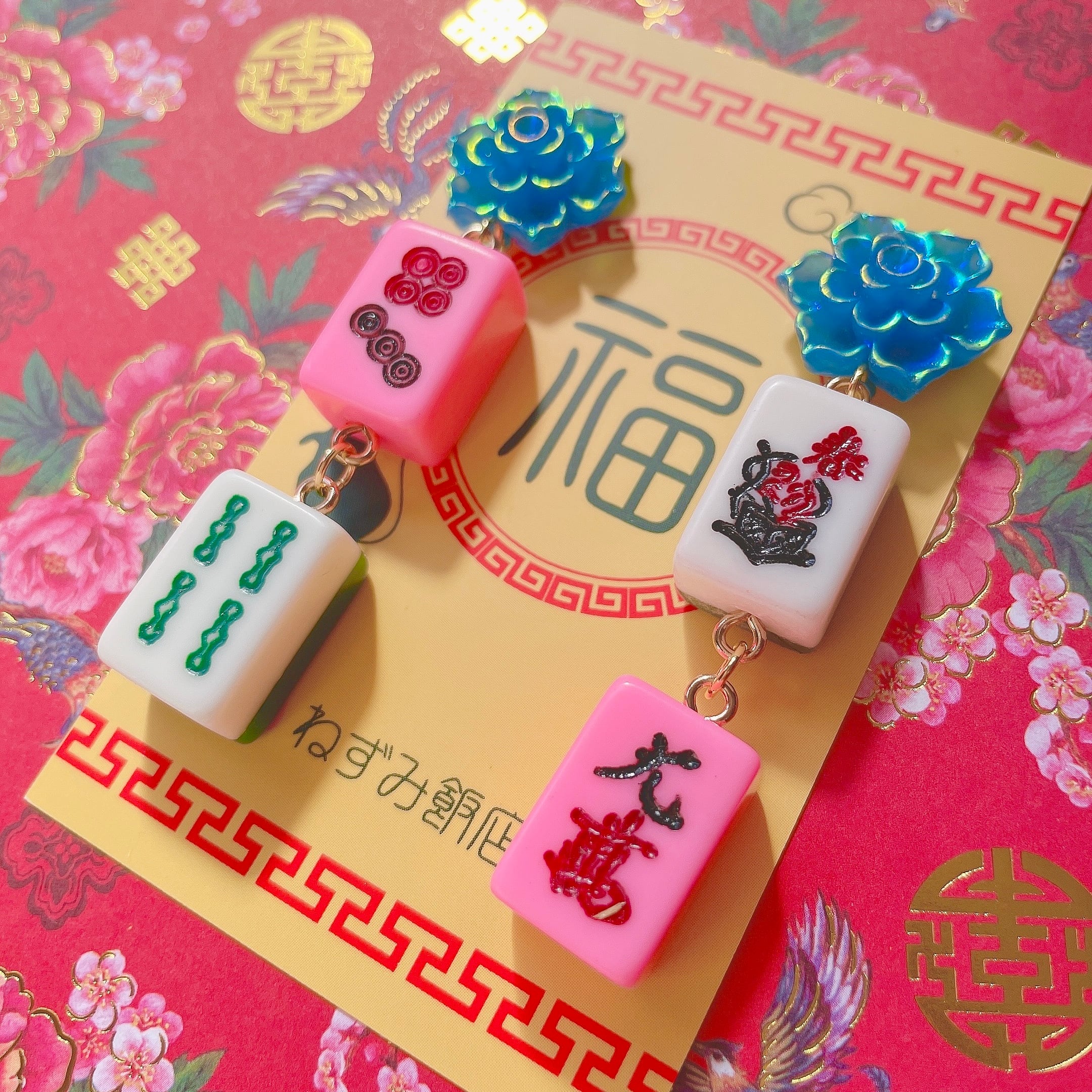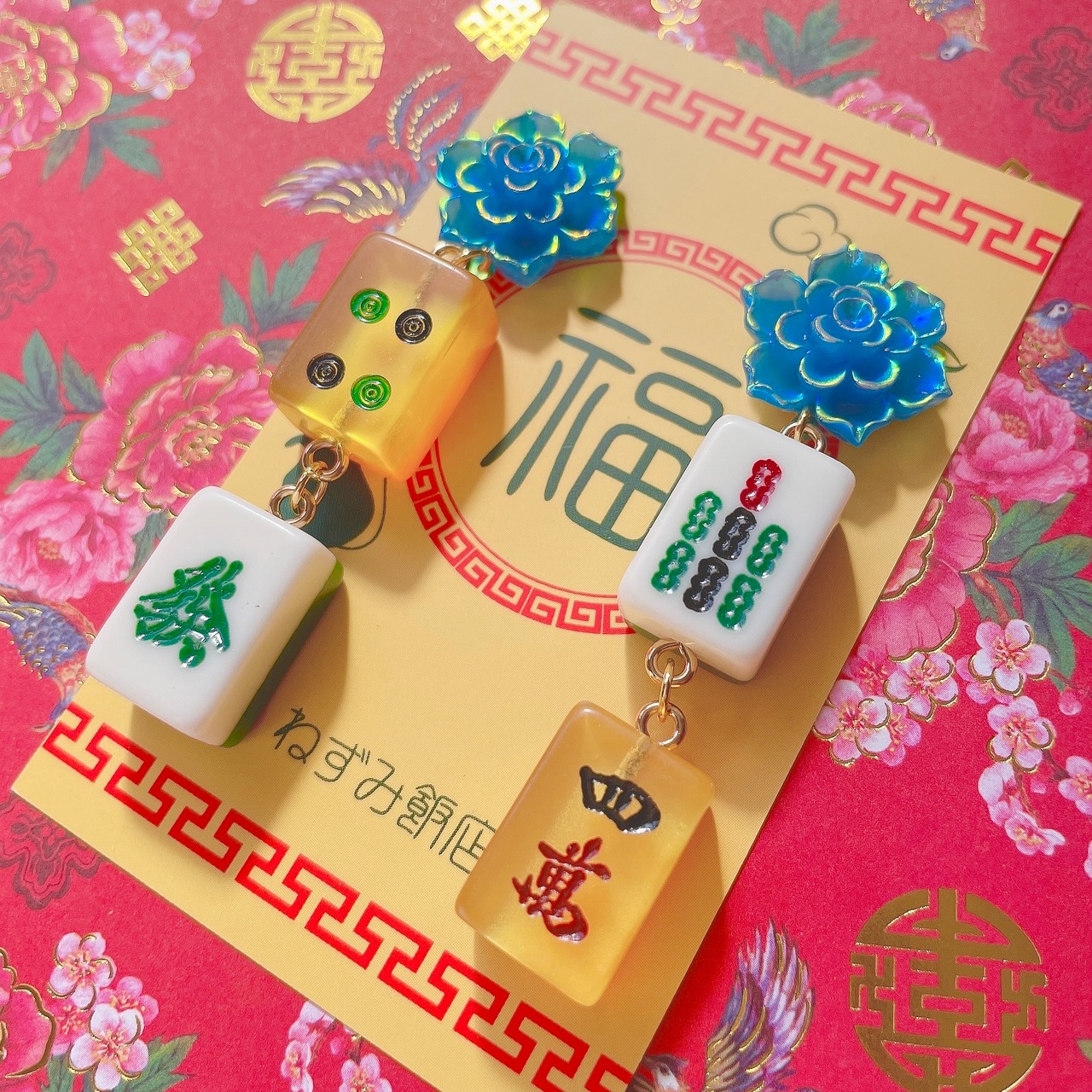 ミニサイズの麻雀牌を二つ連ねた耳飾り。