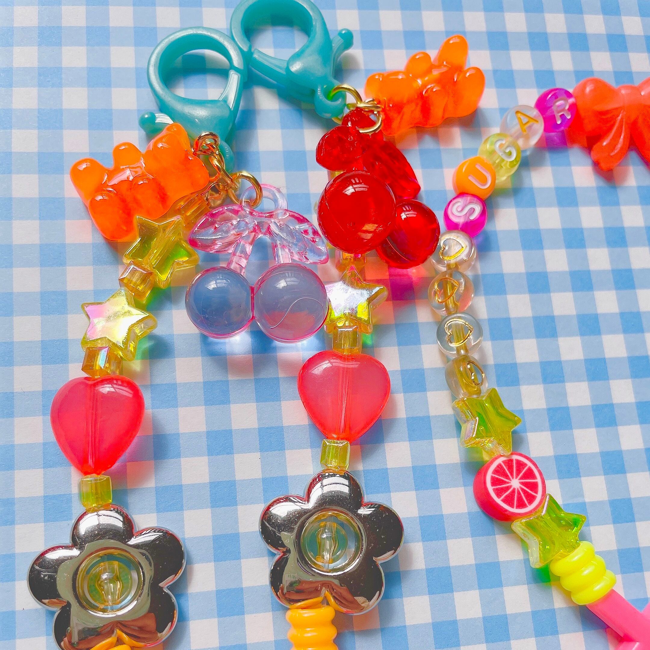 お馴染みの十字架や、うなじ部分のロゴビーズはそのままに、メタリックなフラワーフレームやゼリーみたいなハート、フルーツの樹脂ビーズを連ねたビタミンカラーが元気いっぱいなデザインです。