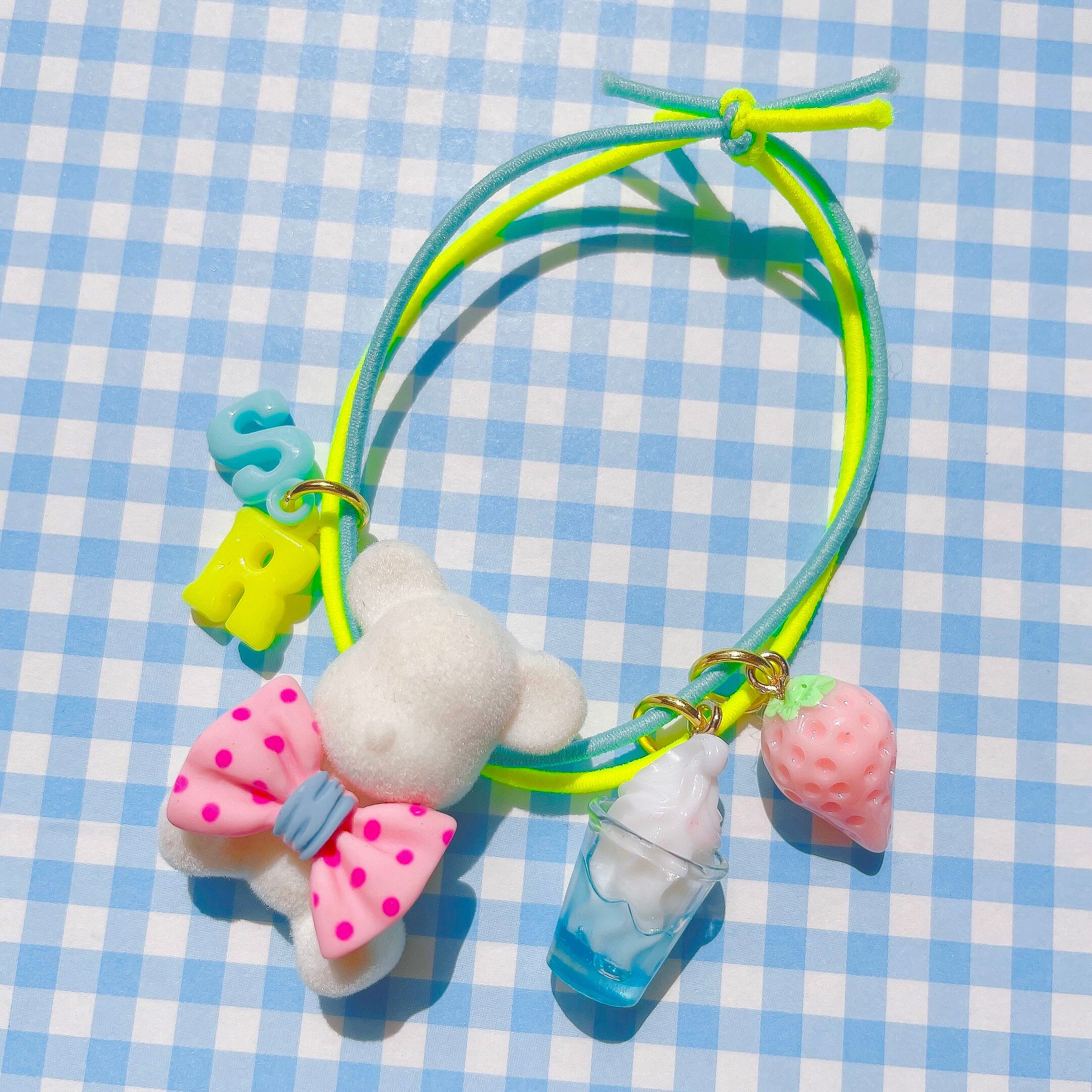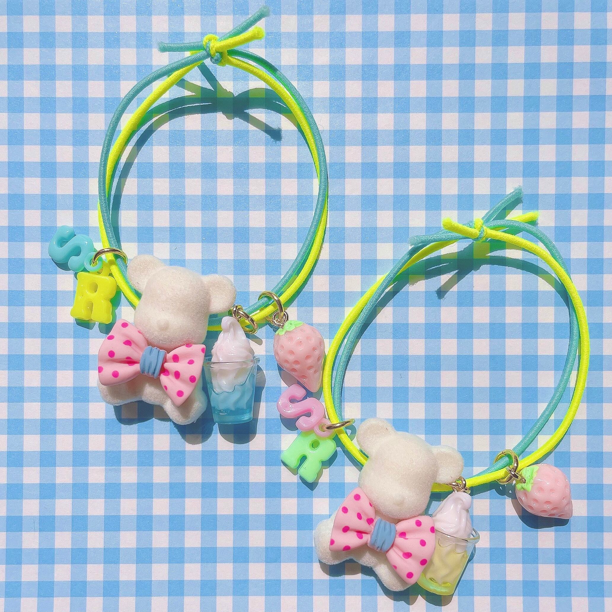 ドットリボンでおめかししたフロッキー素材のくまちゃんと、クリームソーダ、苺が揺れるヘアポニー。