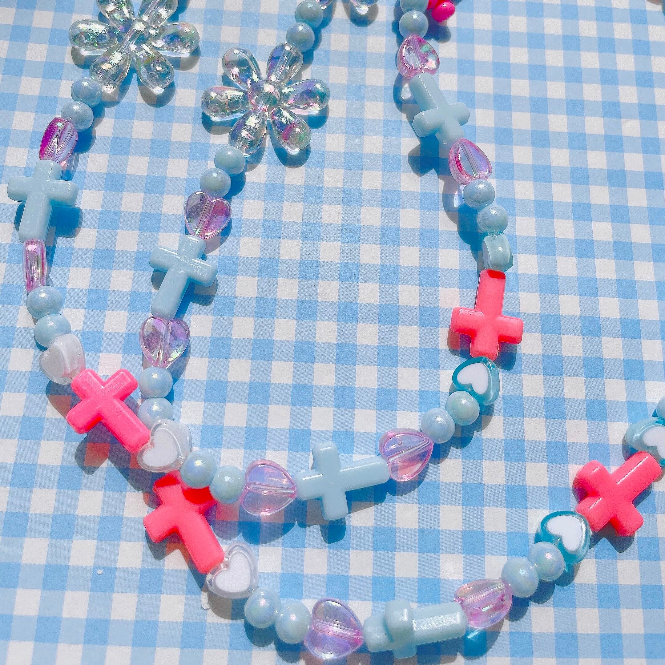 オーロラクリアのお花、お馴染みの十字架やハートのビーズ、クリアやサックスブルーの涼し気な色合いに、ピンクが利いた一本です。