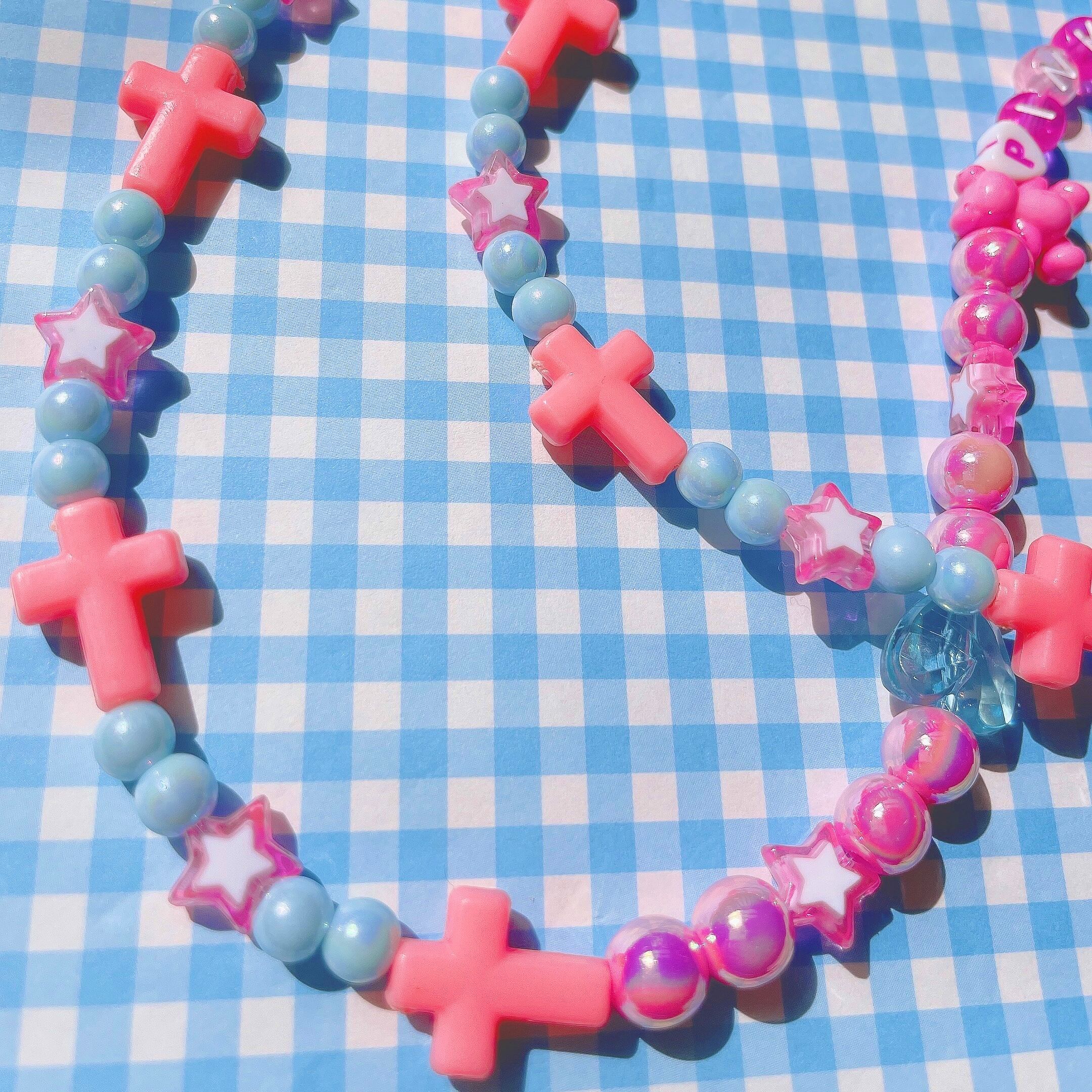 顔周りにはハートの樹脂ビーズ、お馴染みの十字架ビーズに、うなじ部分には【Pinky Dream】のアルファベットビーズを連ねました。