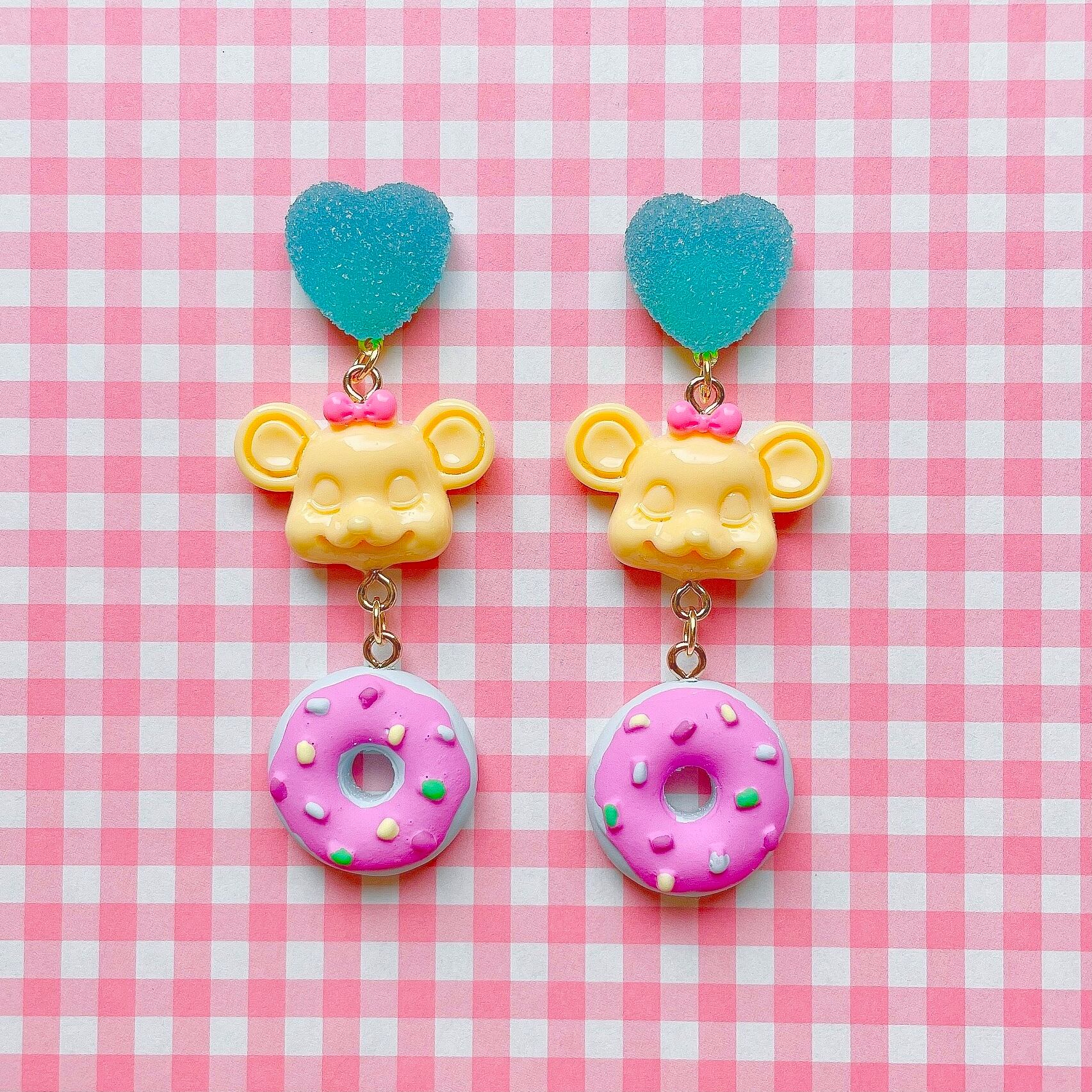 ザラメグミ風なハートとりぼんでおめかししたねずみちゃん、ドーナツが揺れるピアス。