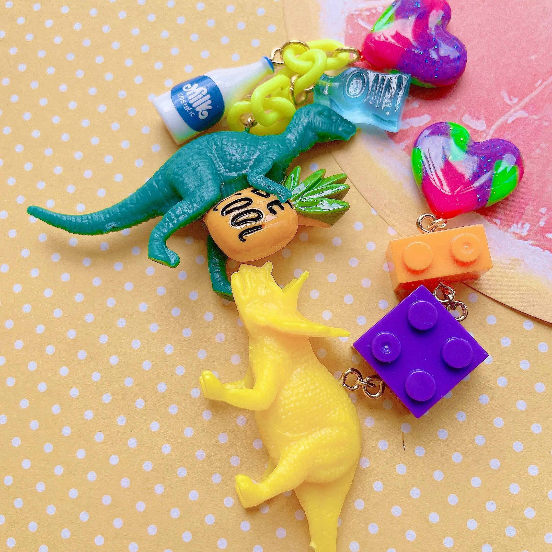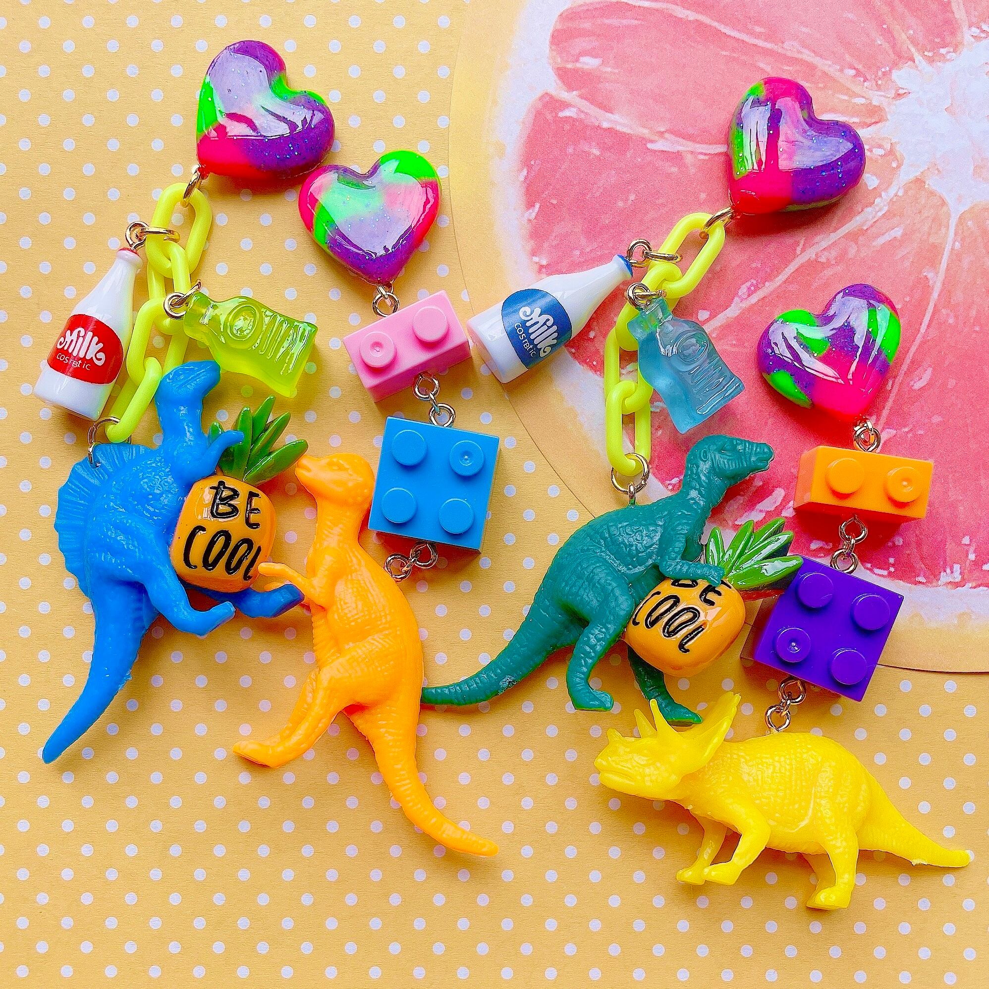 カラフルな恐竜たちやブロックが揺れるピアス。
