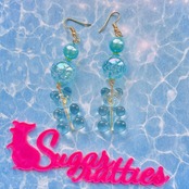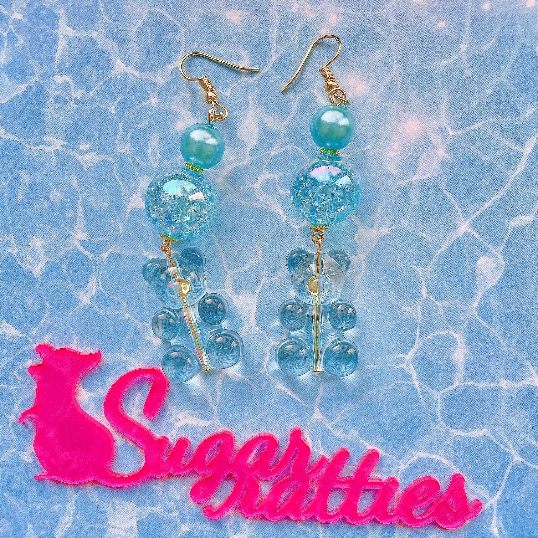 パールにオーロラクラックビーズ、クリアのビッグサイズグミベアが揺れるピアス。