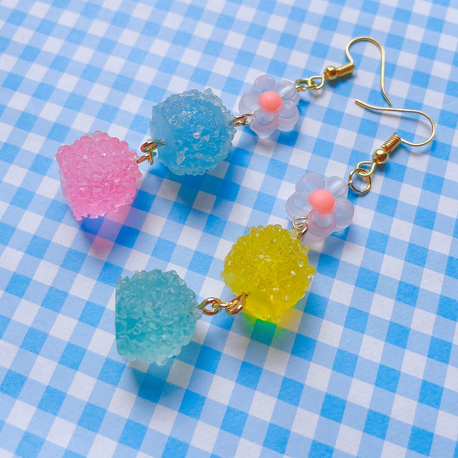 フロスティなお花にころんと可愛いお菓子みたいなモチーフが揺れるピアス。