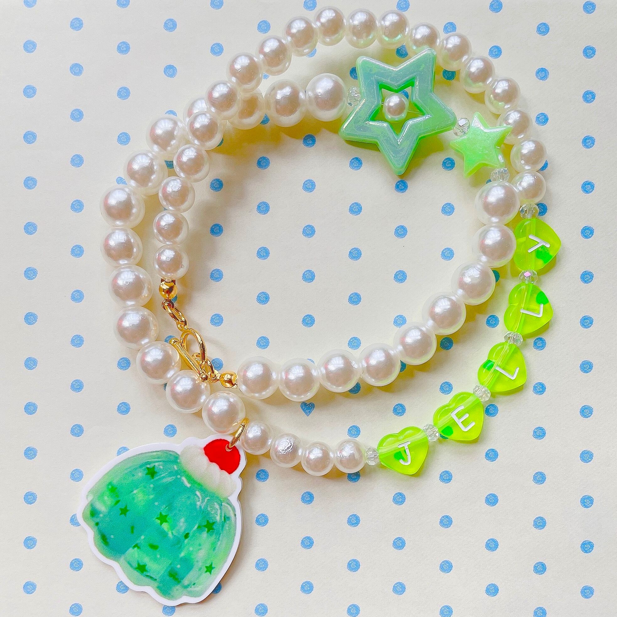 10mm、8mmパールにガラスビーズ、ハートのアルファベットビーズなどを連ねたアシンメトリーなデザインに、ぷるぷるなメロンゼリーが揺れるネックレス。